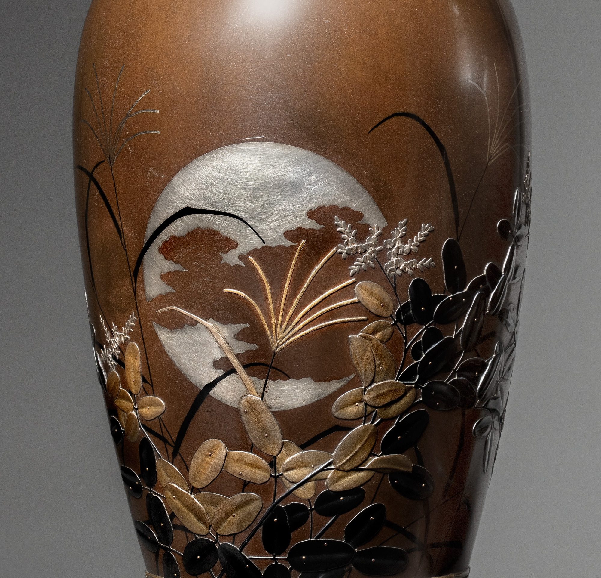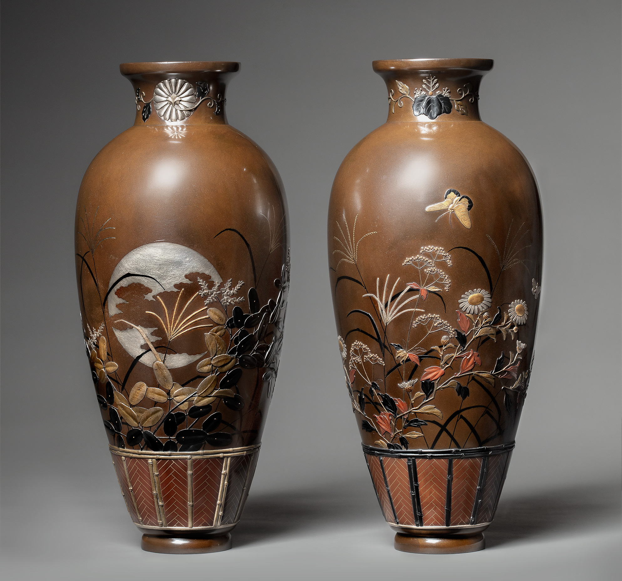 Парные вазы выполнены из японского ювелирного сплава сибуити1 и украшены в стиле иро-э («цветная картина на металле»). Тончайшей ювелирной инкрустацией золотом, серебром, сплавом сякудо2 и медью акаганэ3, выполненной в высоком и плоском рельефе, воссозданы изображения нежных осенних трав, освещенных полной Луной, и пролетающий над ними маленький мотылек.