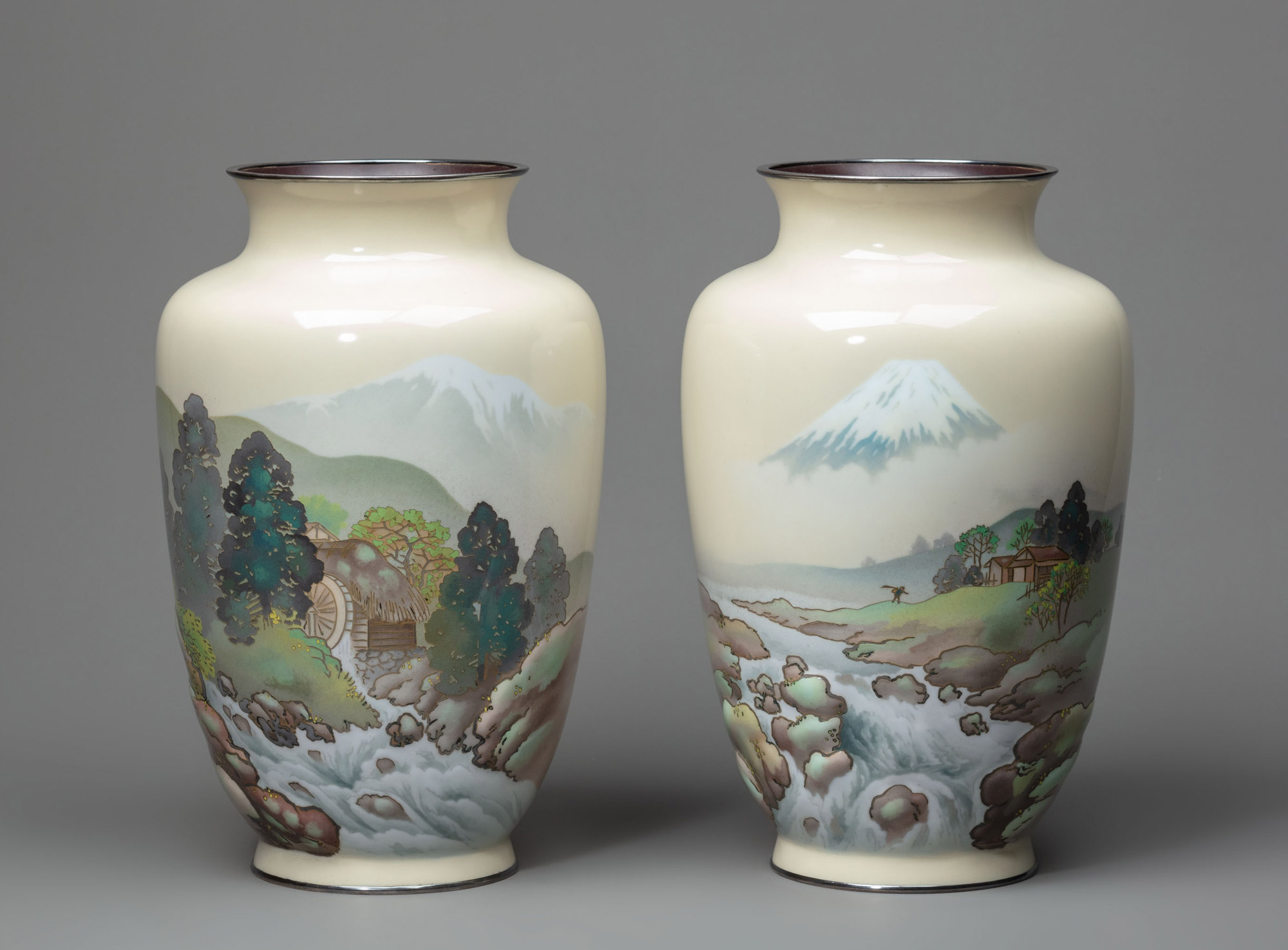 Парные вазы декорированы эмалями в техниках перегородчатой, бесперегородчатой и объёмной эмали. На фоне цвета слоновой кости изображены пейзажи. На переднем плане — горные реки, огибающие валуны, вокруг которых вода взбивается в белую пену. Центральный сюжет на одной из ваз — домик у реки с крестьянином, идущим к нему; на заднем плане — возвышающаяся над облаками заснеженная вершина горы Фудзи. На другой вазе изображена речная водяная мельница на фоне снежных горных вершин. Окантовки горла и основания выполнены из серебра.