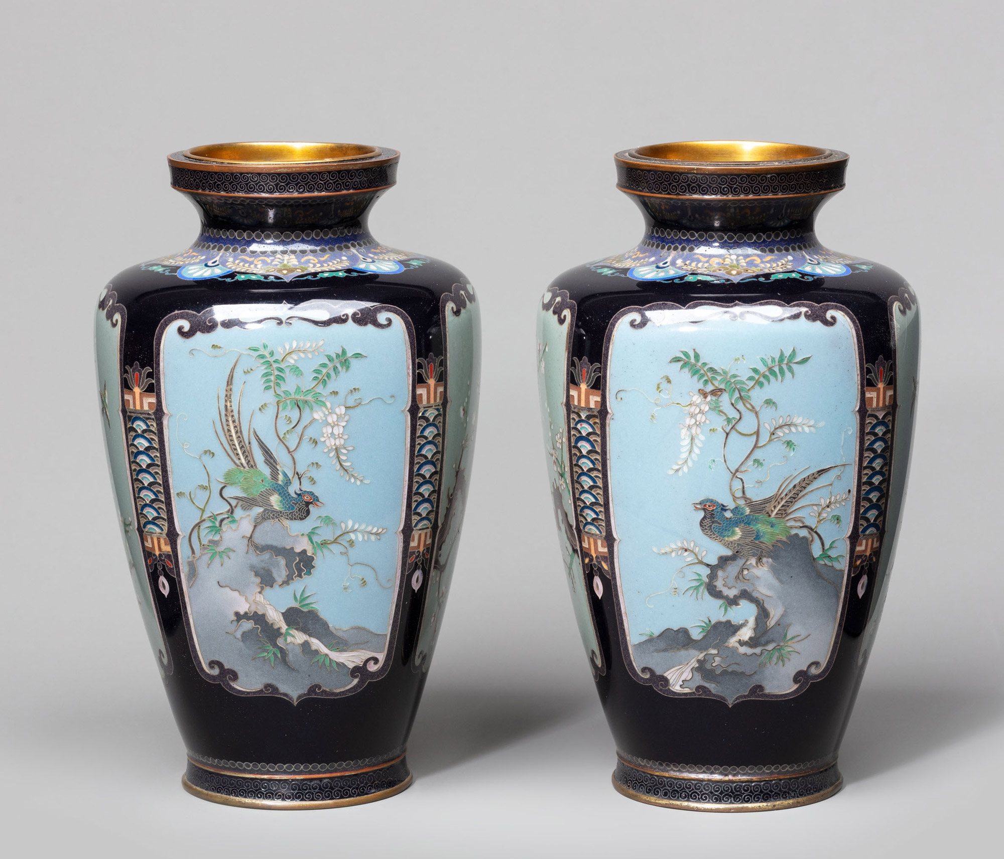 Парные вазы с четырьмя мягкими гранями и прямым оплечьем с небольшим горлом, обрамлённым прямоугольным валиком, изысканно декорированы тонкой перегородчатой эмалью (юсэн-сиппо). Основой ваз служит позолоченный медный сплав, а перегородки для клуазонов созданы из серебра. Кант устья, оплечье и небольшая, слегка расширяющаяся книзу ножка украшены орнаментом.