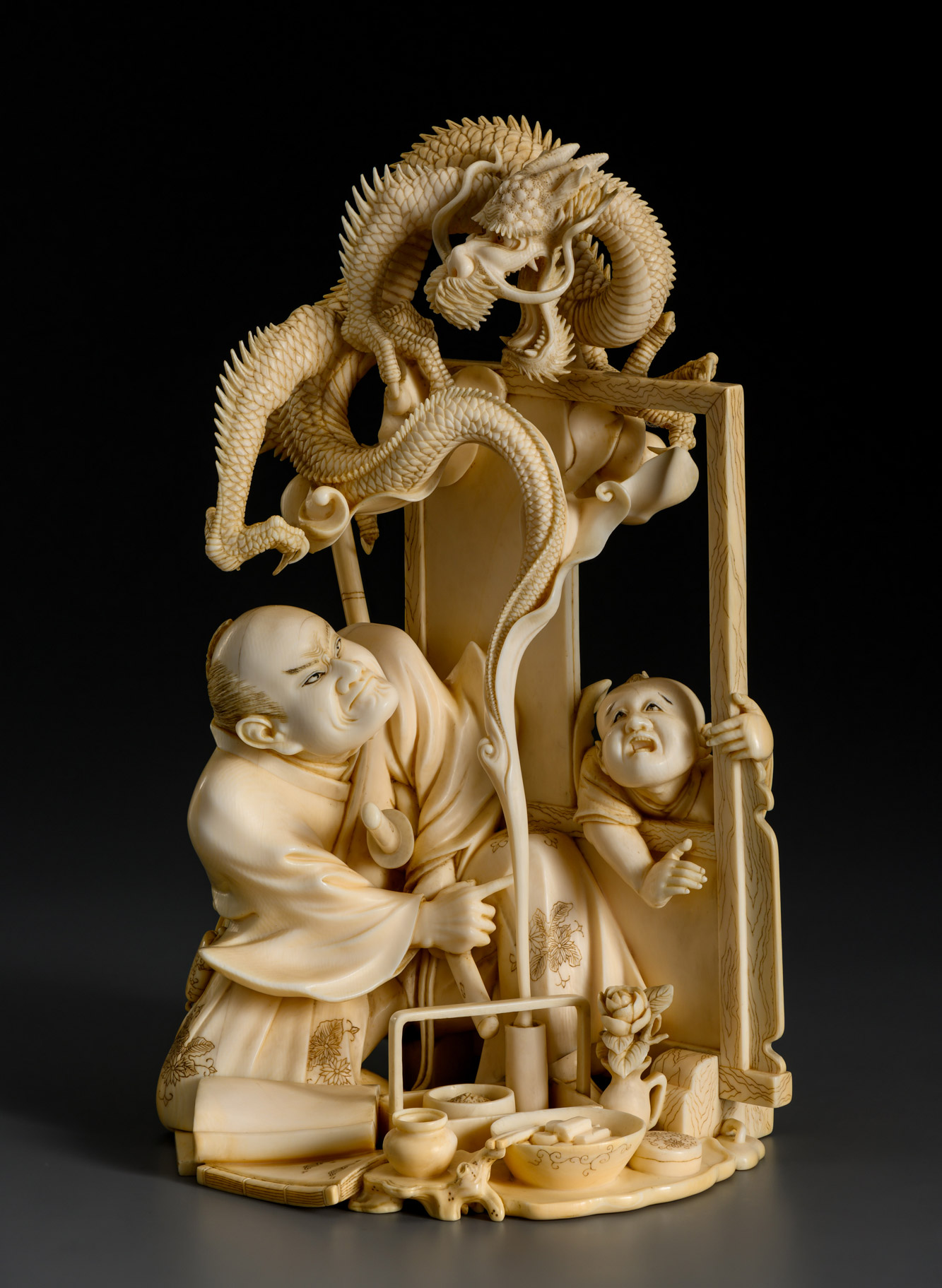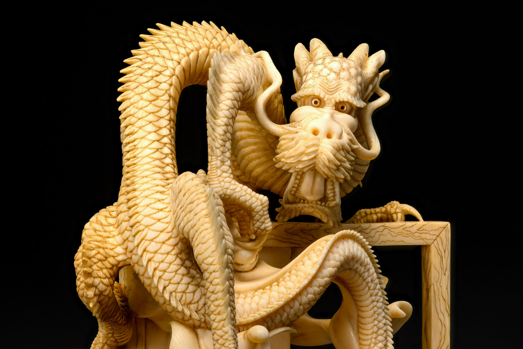 Данная работа демонстрирует высокое мастерство декоративной резьбы по слоновой кости и выполнена на выдающемся художественном и технологическом уровне. Резчик проработал мельчайшие детали, вплоть до узоров на одежде персонажей и отдельных чешуек дракона.