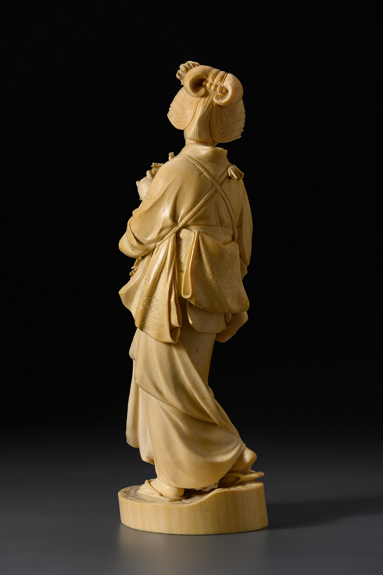 Созданное в технике, доведённой до совершенства, это произведение поражает жизненностью образа. Иллюзию реальности рождает изысканный силуэт красавицы и филигранная проработка мельчайших деталей — характерный приём скульпторов той эпохи. Их искусство стало синтезом: восприняв уроки западного искусства, мастера органично вплели новые веяния в ткань древних национальных традиций. Одним из самых знаменитых воплощений этого синтеза является цикл изображений «красавиц» работы Годзё.