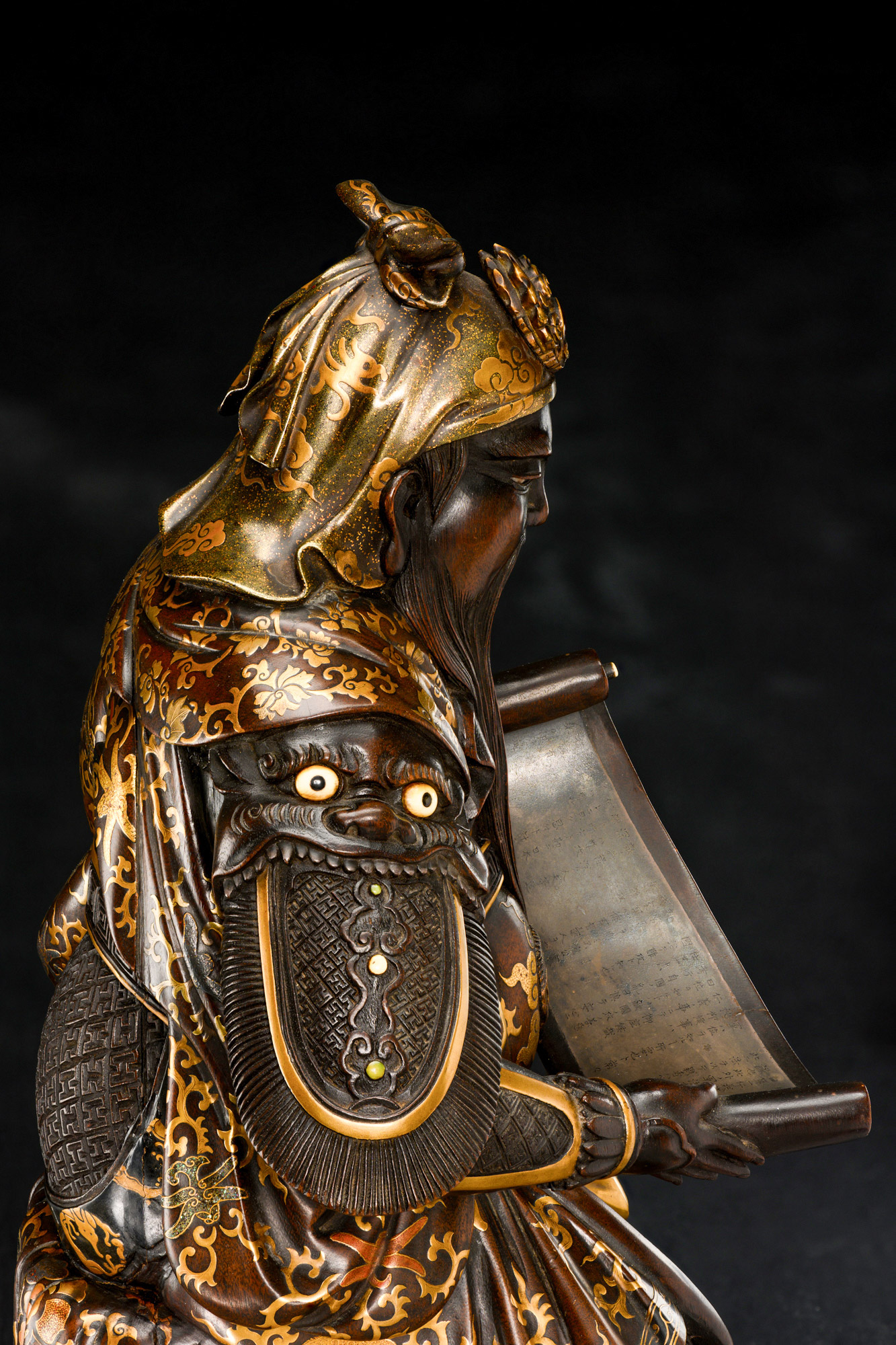 Гуань Юй запечатлен за чтением развернутого свитка — это летопись «Чуньцю» («Весны и осени»), охватывающая историю удела Лу с 722 по 481 год до н. э. Согласно преданию, Гуань Юй с юных лет увлекался изучением этого трактата, авторство которого приписывается Конфуцию. В летописи излагаются незыблемые принципы человеческих отношений, главный из которых — верность государю. Обрести своего государя Гуань Юю довелось в лице Лю Бэя: вместе с генералом Чжан Фэем они заключили с ним вечный братский союз в Персиковом саду.