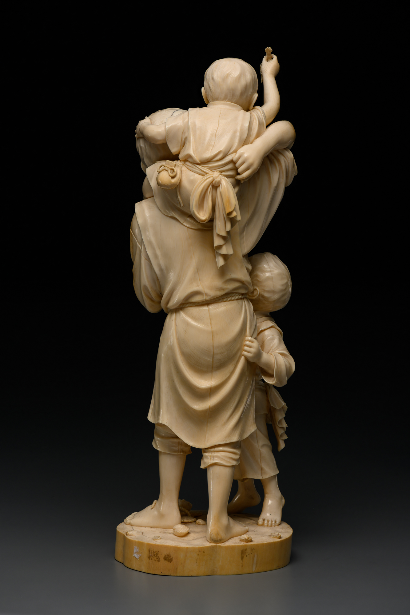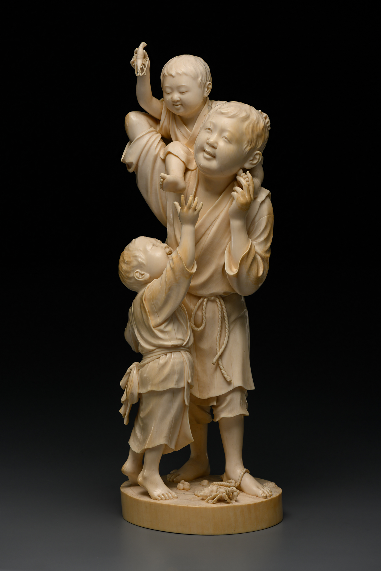 Окимоно создано из крупной слоновой кости высочайшего качества токата и изображает трех детей, играющих на морском берегу. Мальчик постарше держит на плечах малыша, в руке которого зажат японский лангуст исээби. Мальчик помладше, стоящий рядом, приподнявшись на носочки, тянется к нему. Дети одеты в простые подпоясанные короткие кимоно с узкими рукавами. К поясу малыша подвязан небольшой мешочек для мелочей, заменявший карман в традиционной японской одежде. У босых ног мальчишек мастер изобразил морские раковины, рачка и соломенные сандалии малыша.