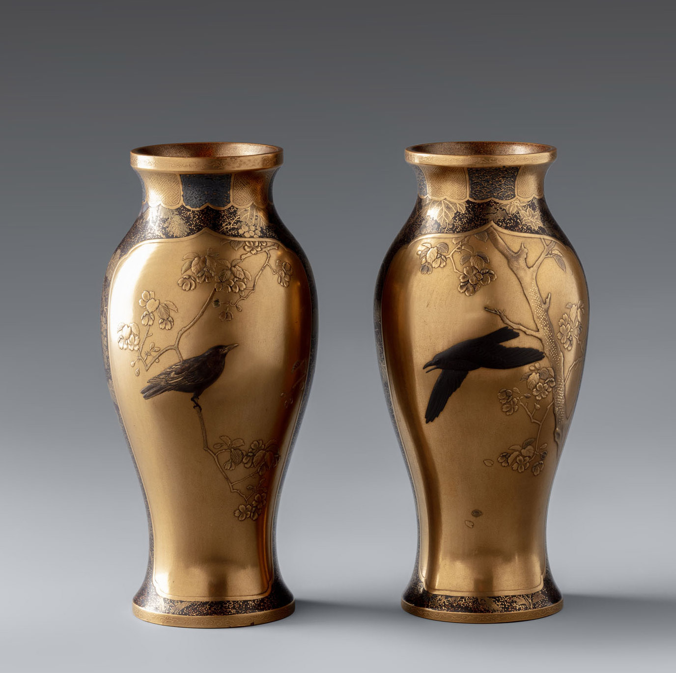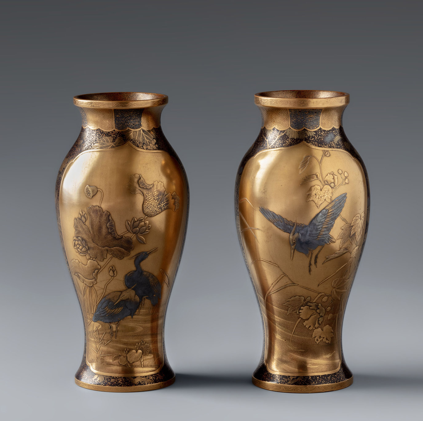 Небольшие изящные парные вазы овоидной формы с расширяющимися книзу ножками, с крутым, почти прямым оплечьем, с невысокими горлами-раструбами, оформленными вокруг устья прямоугольным в сечении валиком. Вазы созданы из японского лака уруси и декорированы золотым лаком в технике маки-э.