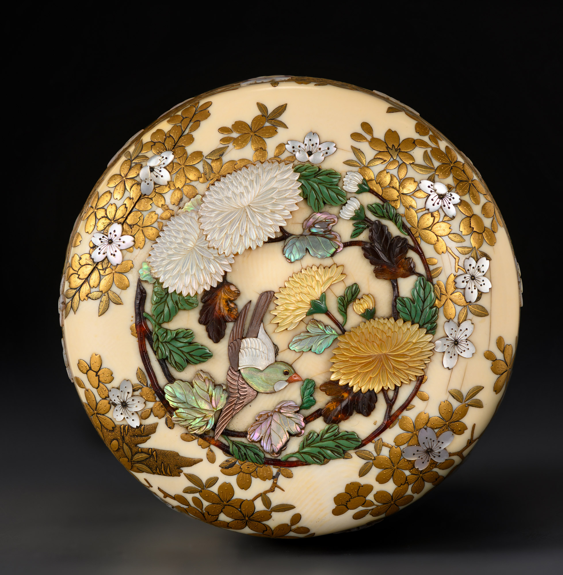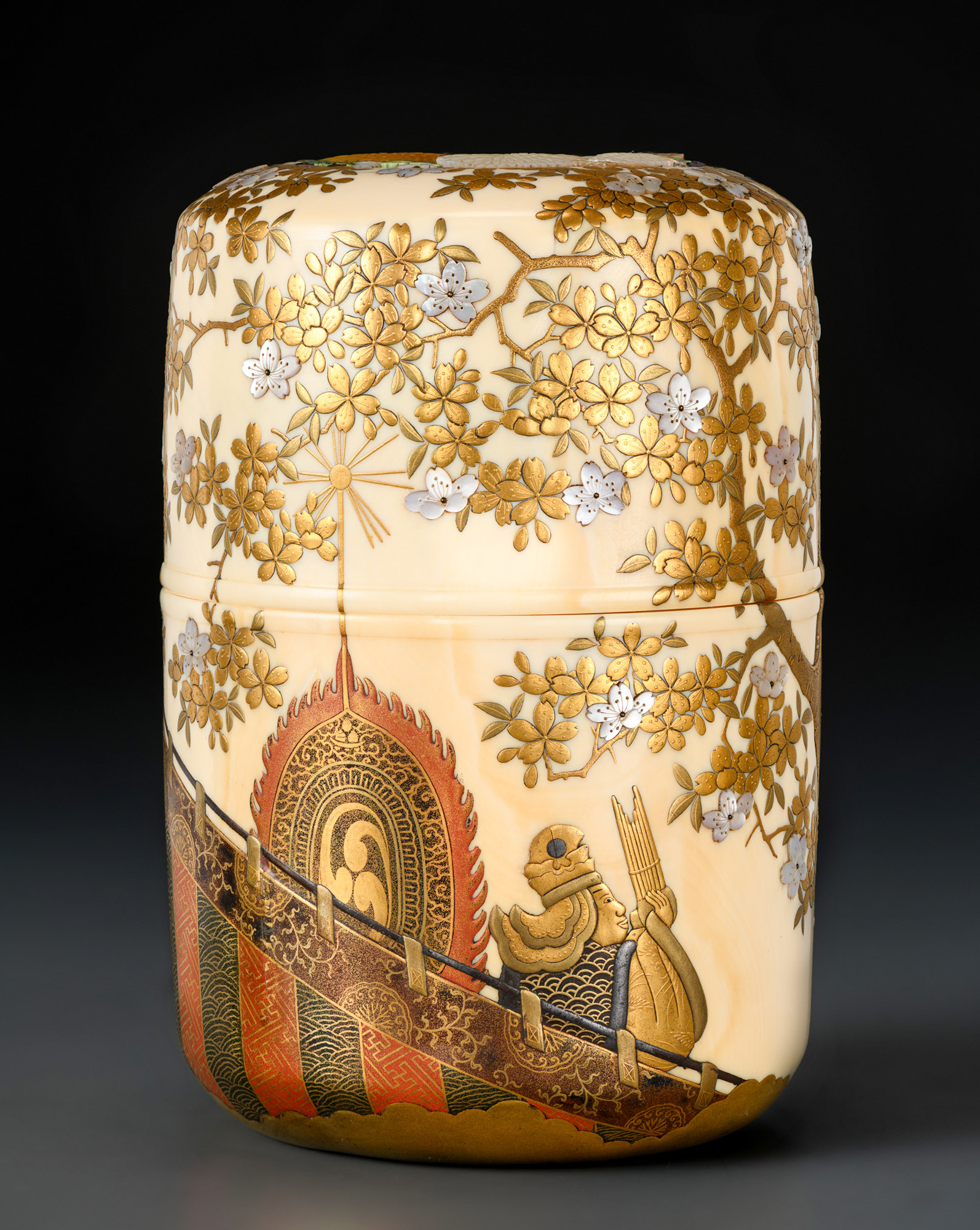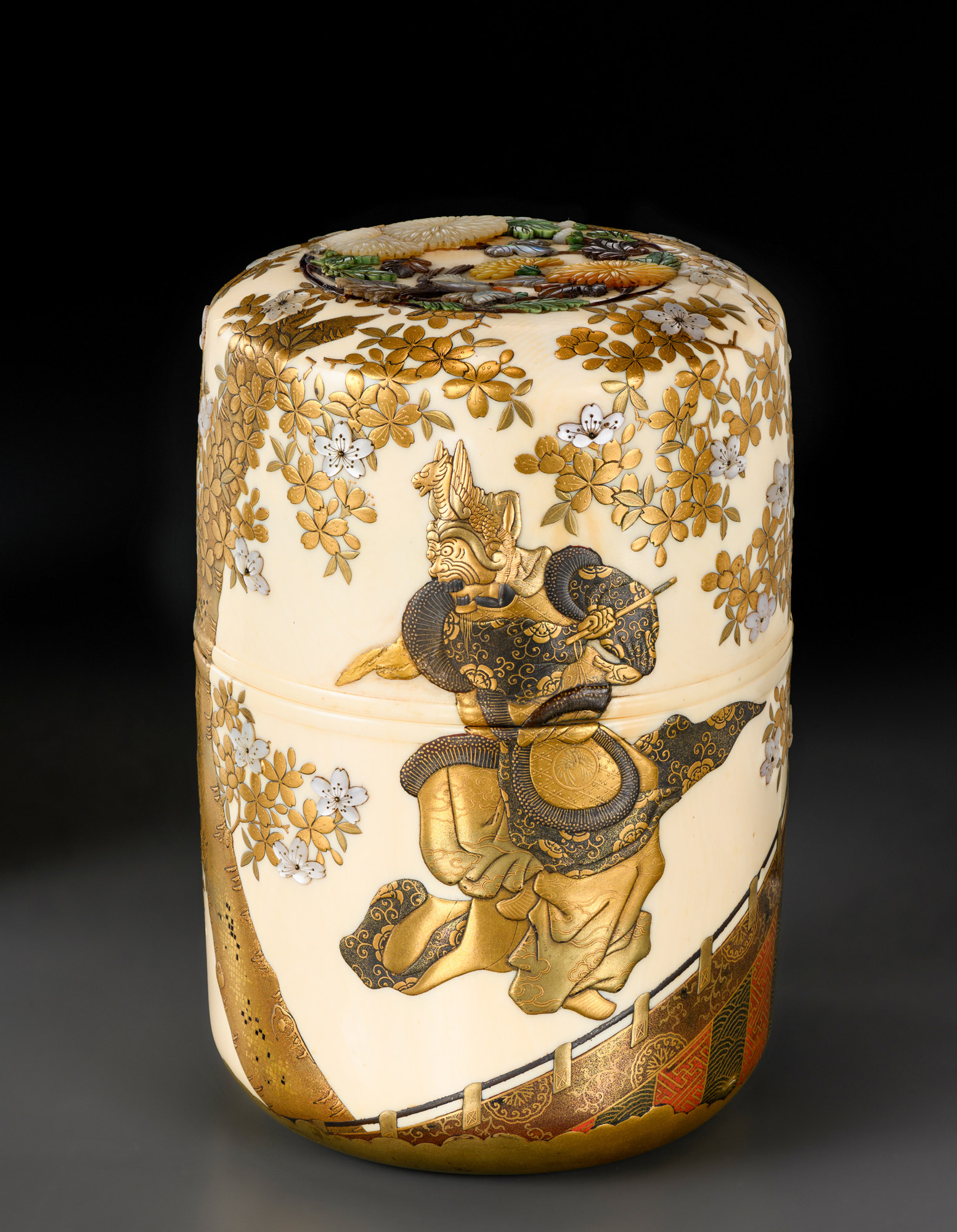 Это утонченное произведение представляет собой нацумэ — коробочку для хранения японского порошкового чая, используемую в чайной церемонии. Она выполнена из тончайшего спила слоновой кости и декорирована в стиле сибаяма лаками маки-э с инкрустацией перламутром, розовым кораллом, рогом, черепашьим панцирем и тонированной слоновой костью.