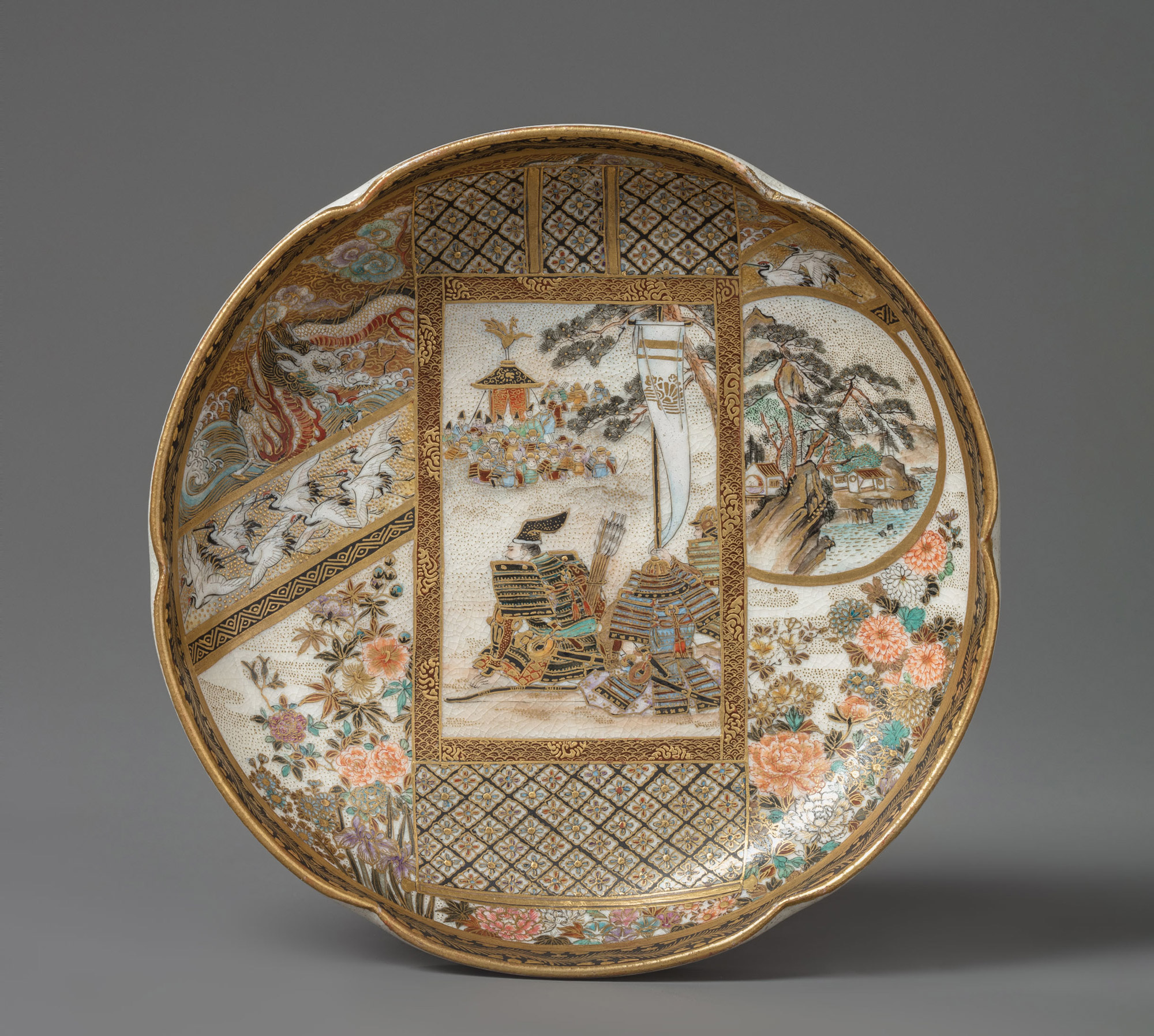 Внутренняя часть чаши украшена разнообразными сюжетами, заключенными в картуши разной формы. Здесь изображены цветы всех сезонов — пионы, хризантемы, ирисы и другие; стая летящих журавлей и грозный дракон среди бушующих волн. В центре композиции, в картуше, стилизованном под свисающий живописный свиток, представлена сцена в жанре «муся-э» («картины воинов»). На ней изображены самураи, сидящие под флагом с гербом кикусуй — «плывущая хризантема». Этот мон принадлежал полководцу Кусуноки Масасигэ (1294–1336), одному из самых почитаемых военачальников Японии. Поскольку хризантема является символом императора, дозволение изображать её на личном гербе человеку, не принадлежавшему к императорской семье, стало уникальным случаем в японской истории. Герб означал, что Кусуноки поддерживает Хризантемовый трон так же, как вода поддерживает цветок на плаву.