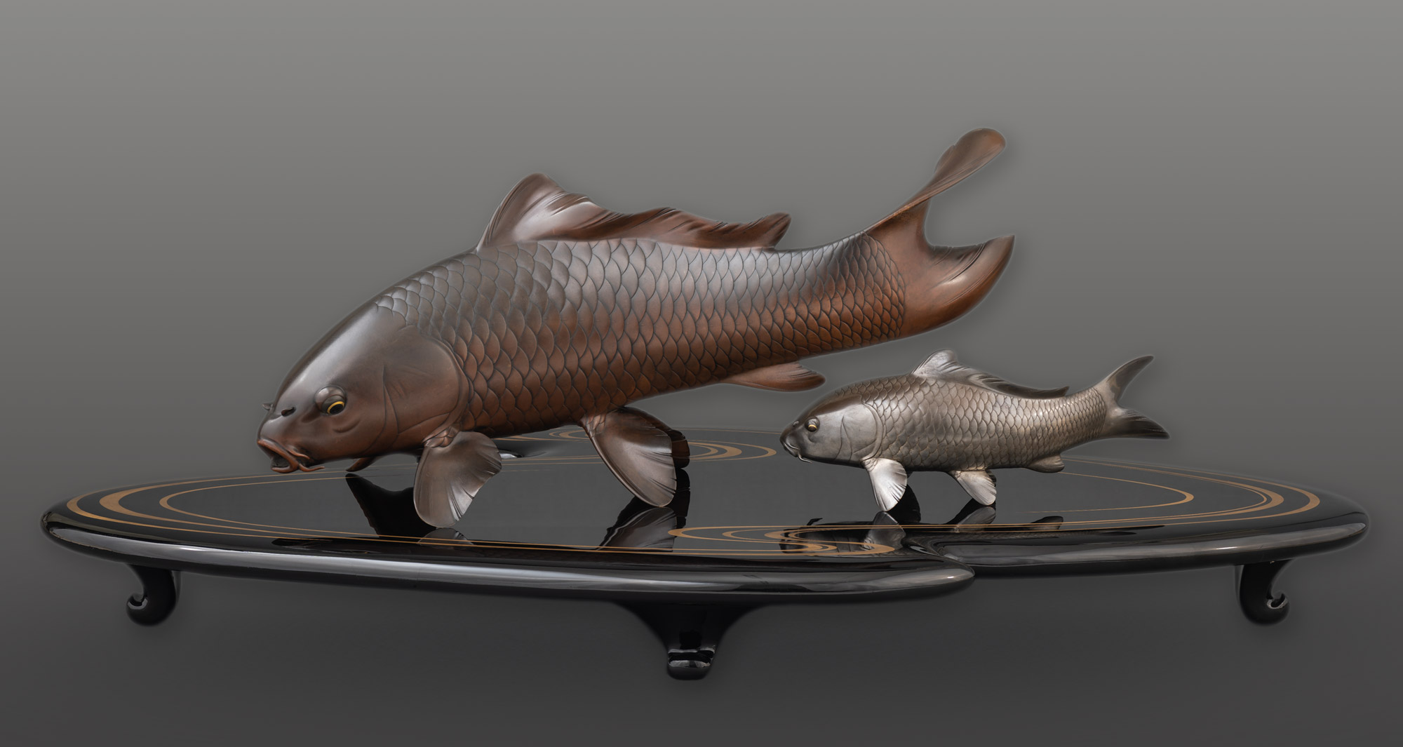 Уникальность представленного произведения обусловлена не только совершенными пропорциями и законченностью композиции, отличающими все работы знаменитого мастера Осимы Дзёуна, но и сложным технологическим исполнением. Следует отметить, что скульптуры выполнены из различных металлов. Так, крупный карп создан из сплава сэнтоку и искусно патинирован в красновато-коричневый цвет. Его глаза выполнены из сплава сибуити и инкрустированы золотом. Второй карп, поменьше, целиком выполнен из сплава сибуити, а его глаза — из сплава сякудо, инкрустированного золотом. Особое внимание стоит обратить на виртуозно выполненную гравировку: свет, попадая на поверхность карпов, создает иллюзию их реалистичности. Добиться ощущения движения в статичной скульптуре — высочайшее мастерство, и Осима Дзёун в совершенстве обладал им.
