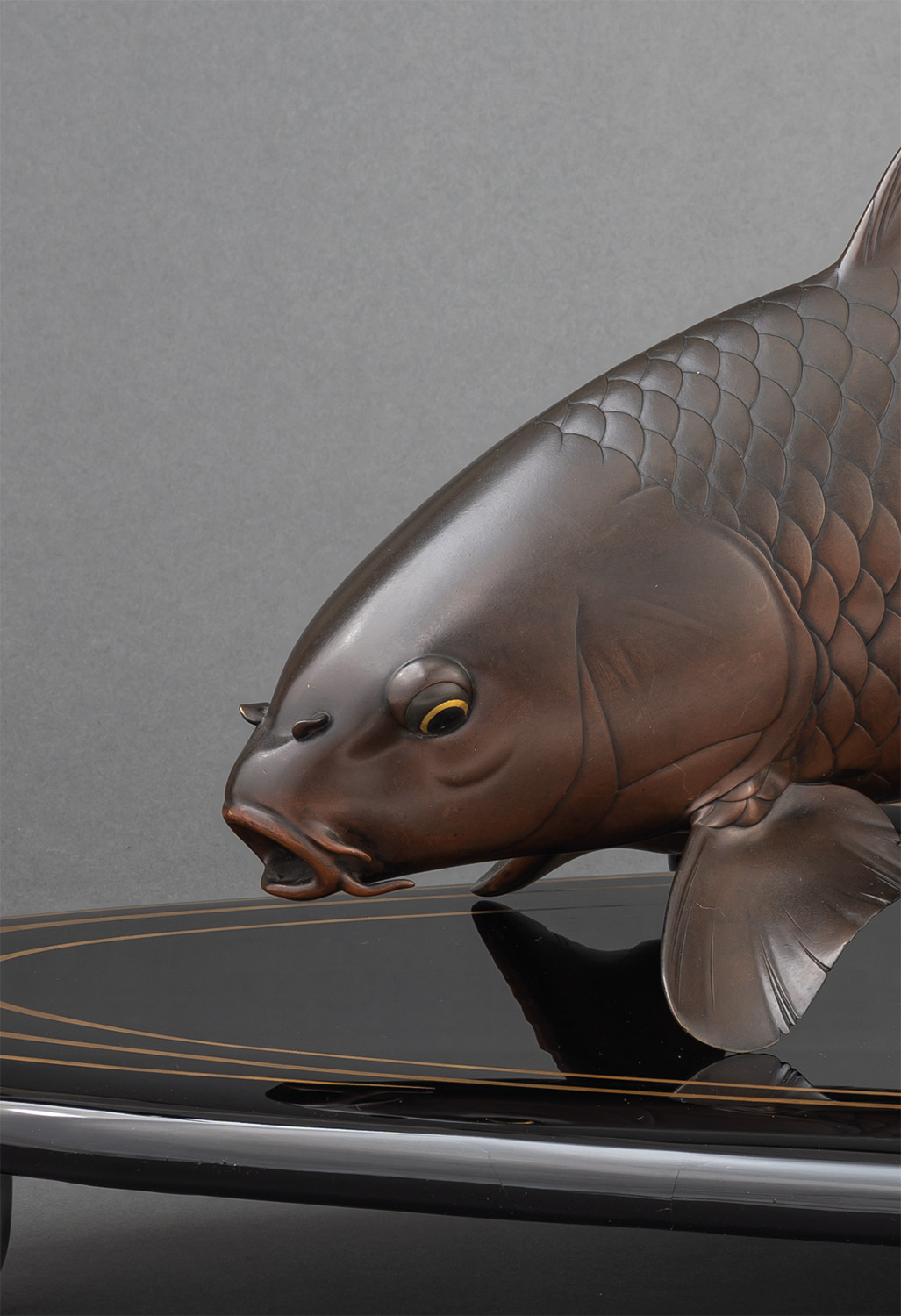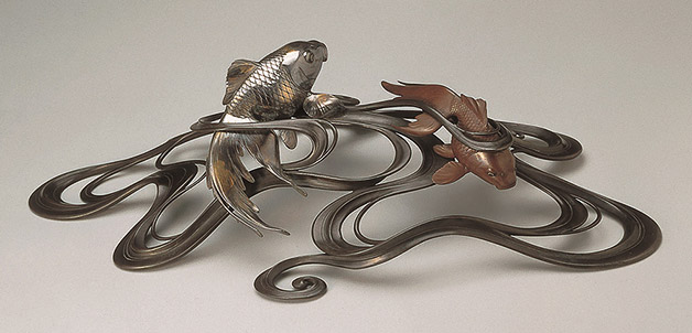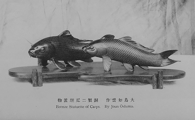 Мастера металлической пластики, такие как Осима Дзёун и его ученики из Токийской школы изобразительных искусств, в 1890-х годах стали уделять больше внимания форме и эстетике изделий, чем сложным и часто перегруженным декором предметам, которые в то время были модными в Японии. Результатом такого подхода стала золотая медаль, полученная Осимой Дзёуном на Всемирной выставке 1900 года в Париже. Именно к таким утонченным и лаконичным по композиции произведениям Осимы Дзёуна относятся и эти великолепные фигуры карпов. К теме изображения карпов мастер возвращался не раз — аналогичное произведение «Пара карпов» выставлялось на XIX выставке Токийской ассоциации скульпторов 1905 года как эталон нового направления в искусстве, с которого рекомендовалось брать пример молодым художникам3.