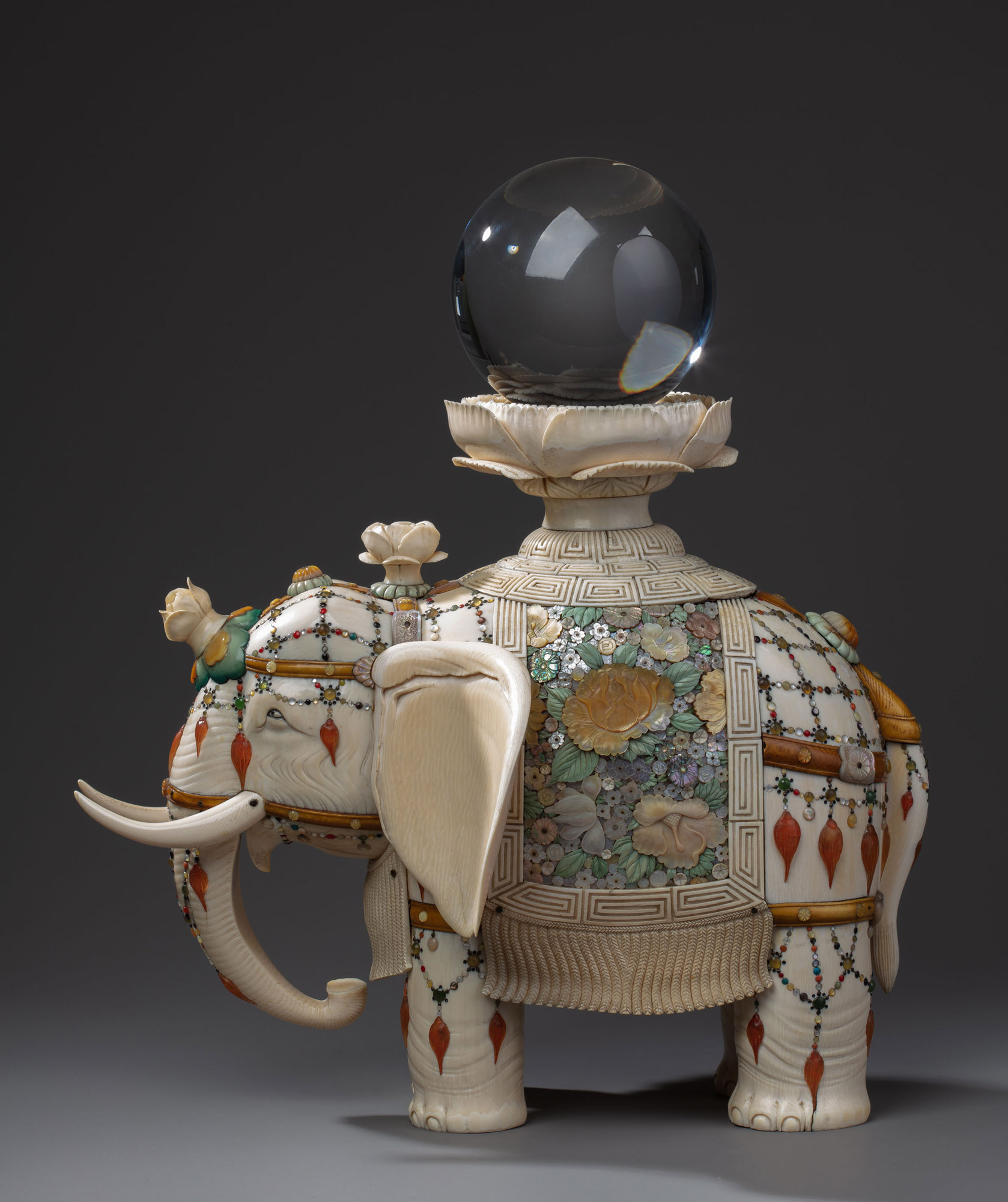 Окимоно, изображающее буддийского слона, выполнено в стиле сибаяма. Слон застыл в позе с прямыми ногами и опущенным хоботом. Его убранство состоит из сбруи и ажурной попоны, усыпанной драгоценными инкрустациями со свисающими кистями. Попона украшена фигурными пластинами из перламутра и тонированной кости, образующими узор из разнообразных цветов: пионов (символа богатства), хризантем (символа долголетия) и других. Паланкин на спине слона выполнен в виде цветка лотоса — одного из главных символов буддизма. На паланкине сверху расположен прозрачный стеклянный шар. К сбруе на голове животного также прикреплены крупные скульптурные цветы лотоса.