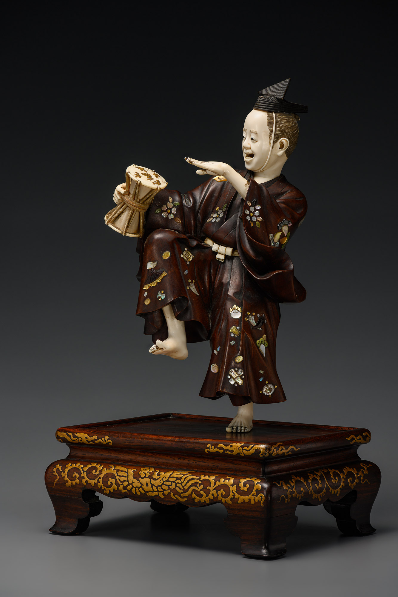 Скульптуры выполнены из дерева, декорированы инкрустацией различными материалами (тонированная слоновая кость, перламутр, рог, панцирь черепахи) в стиле сибаяма1 и дополнены элементами из слоновой кости (головы, руки, ноги, атрибуты персонажей). Окимоно установлены на отдельные деревянные подставки на четырех ножках с фигурными подзорами, украшенными изображениями птицы Хоо среди растительных узоров из завитков каракуса («китайская трава»), созданных золотыми лаками такамаки-э (объемный золотой лак).