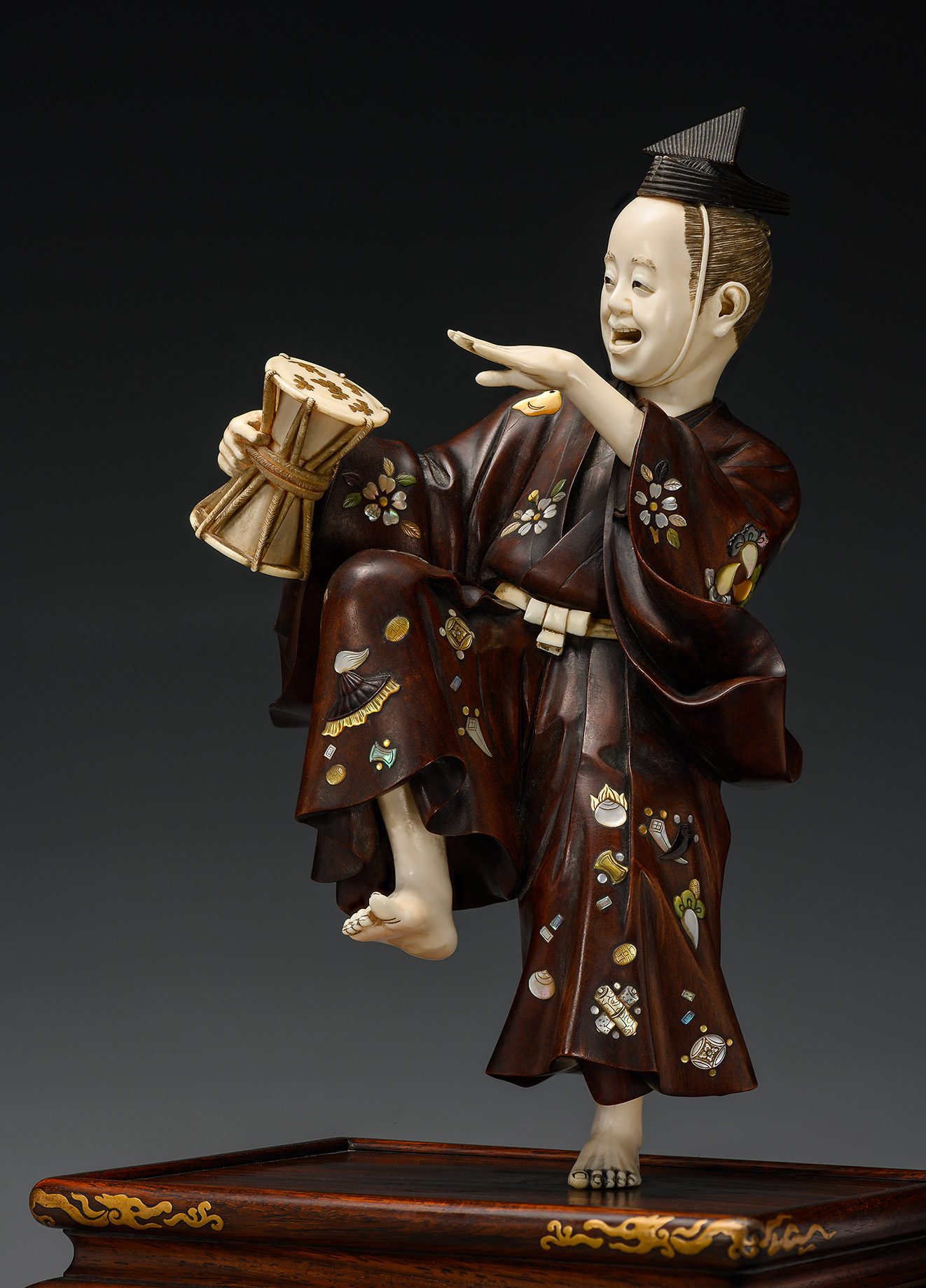 На спинах персонажей расположены перламутровые вставки с выгравированными иероглифами «宮尾», которые читаются как «Мияо». Это подпись одноимённой мастерской, основанной Мияо Эйсукэ и специализировавшейся на художественных изделиях из бронзы, дерева и слоновой кости. Мастерская работала в Иокогаме на рубеже XIX–XX веков. В ней трудилось множество талантливых скульпторов и резчиков, и в период Мэйдзи она стала одним из ведущих в Японии центров по созданию экспортных произведений искусства. В стилистике её изделий органично соединились реалистические традиции японской пластики и влияние западноевропейского искусства.