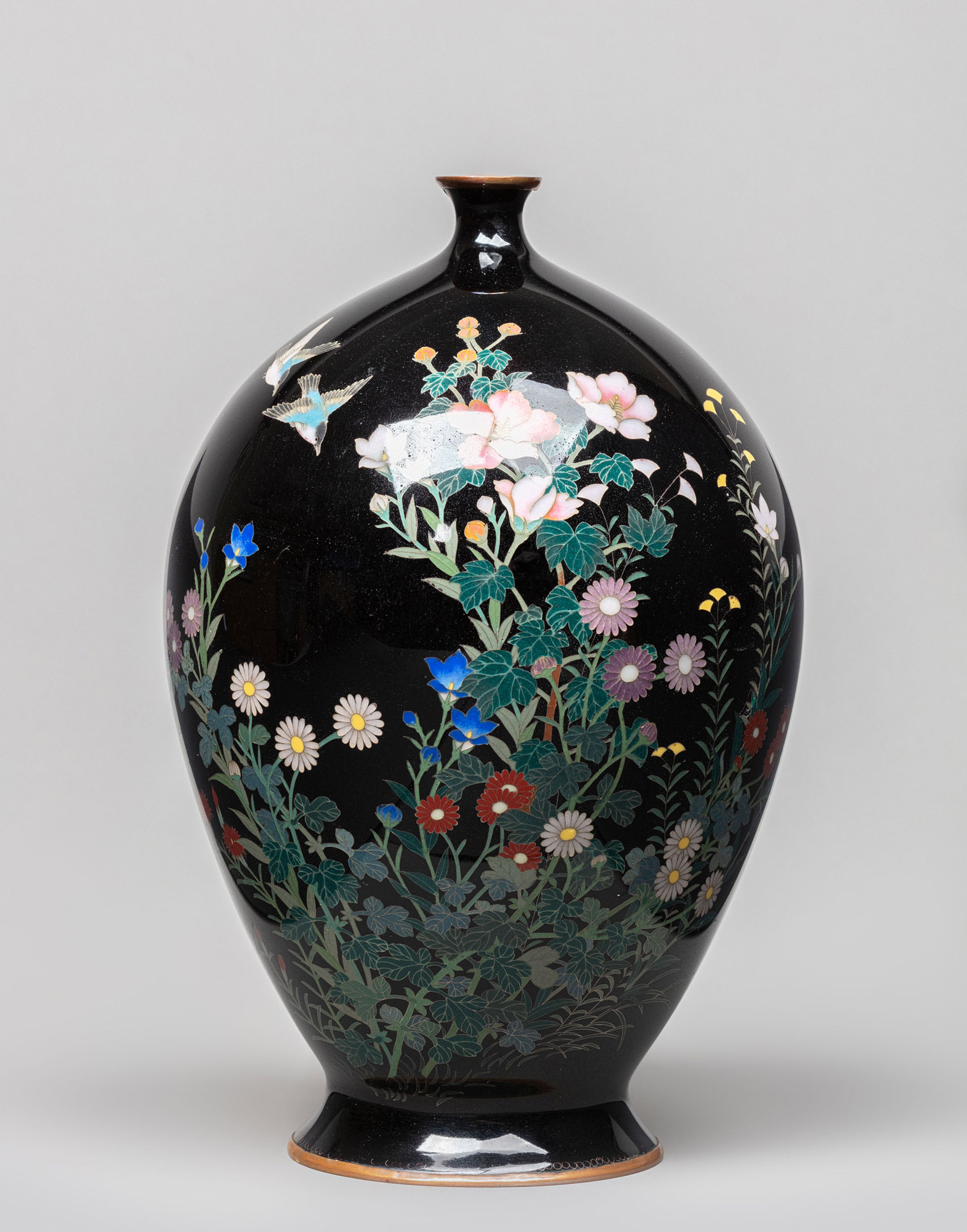 Небольшая вазочка с узким горлышком и расширяющейся книзу ножкой украшена эмалями юсэн-сиппо. На глубоком черном фоне изображены дикие хризантемы и осенние травы, над которыми летит стайка японских синиц. Ваза выполнена в мастерской известного эмальера Гонда Хиросукэ, что подтверждается штампом в центре донышка — маркой «Гонда» — знаком слоговой японской азбуки «コ» («ко»), помещённый внутрь «пламенеющей жемчужины мудрости» (ходзю).