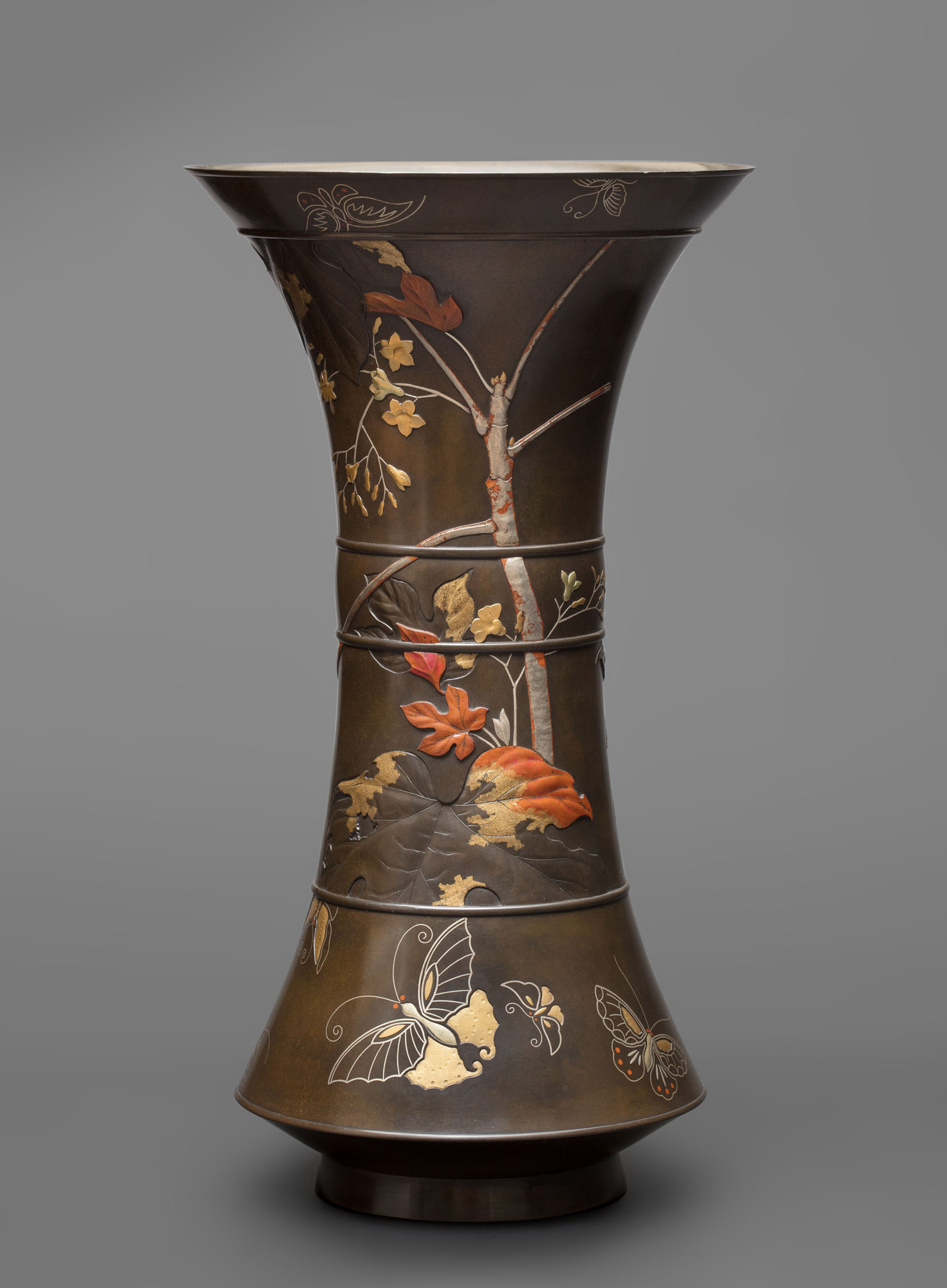 Данная ваза — выдающийся образец японской металлопластики периода Мэйдзи (1868-1912). Ваза выполнена в форме китайской ритуальной винной чаши гу — высокого узкого сосуда, расширяющегося у основания и устья, с характерным сужением в центральной части. Изделие отлито из бронзы и декорировано в стиле иро-э («цветная картина на металле»). Для украшения поверхности использованы гравировка, а также инкрустация в техниках такадзоган (высокий рельеф) и хирадзоган (низкий рельеф) с применением золота, серебра, сплава сибуити и меди акаганэ. Дополнительный эффект создаёт искусное патинирование.