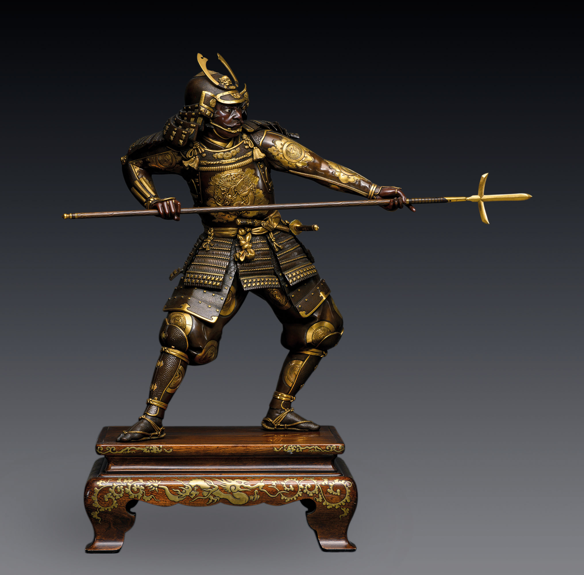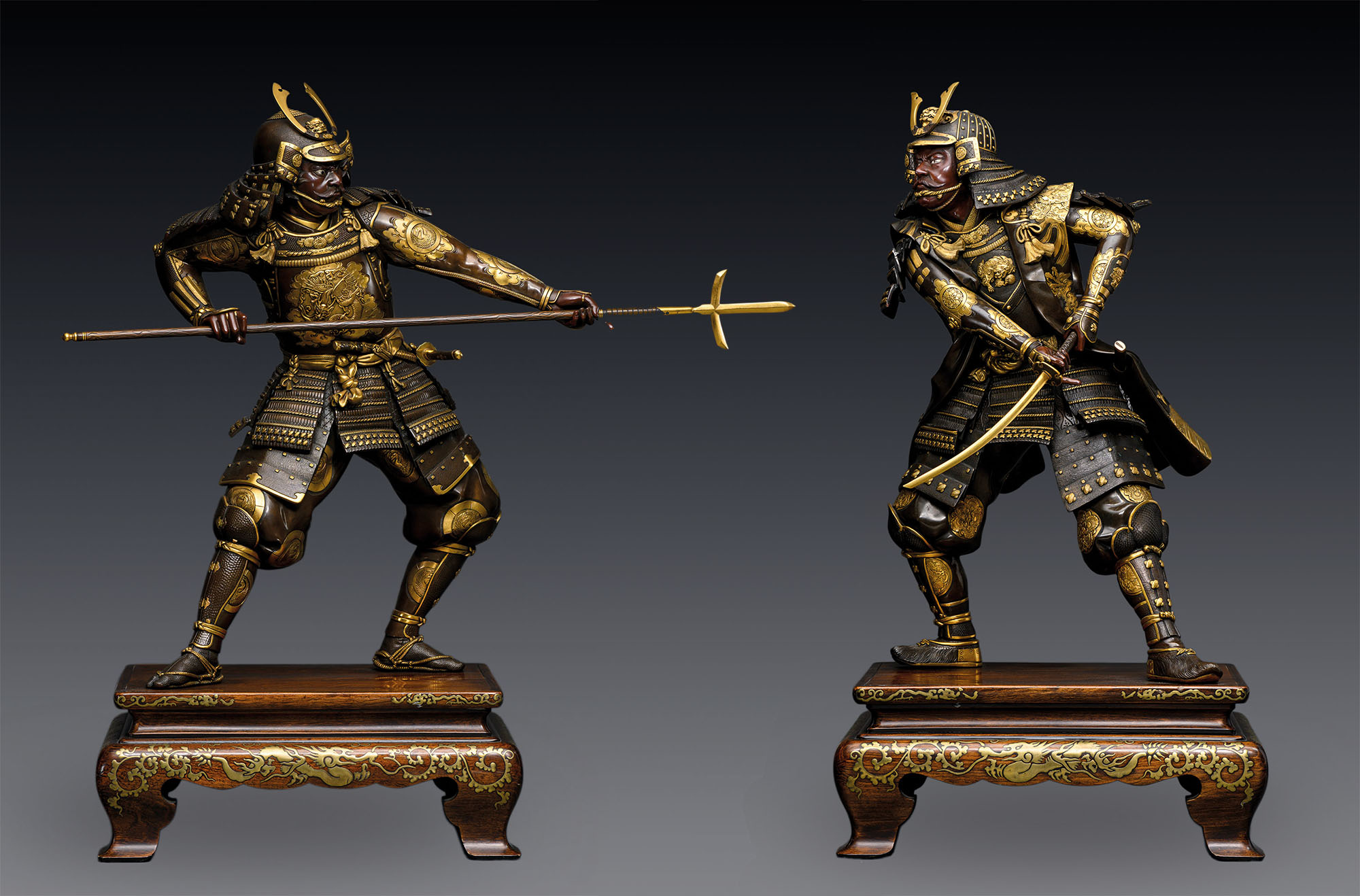 Композиция создана методом сложного литья с филигранной последующей обработкой поверхности, включающей ямочную и штриховую гравировку, тональное патинирование и золочение. Позолоченные рельефные детали доспехов и одеяний эффектно контрастируют с глубокой темной патиной, что придает фигурам особую торжественность и визуальную объемность. Атрибуты воинов — меч катана и алебарда нагината — являются вставными, что демонстрирует высочайшее мастерство литья и сложность конструкции. Монументальные фигуры установлены на деревянные подставки, боковые стороны которых украшены изображением драконов среди завитков каракуса («китайская трава»), выполненным золотым лаком в технике такамаки-э.