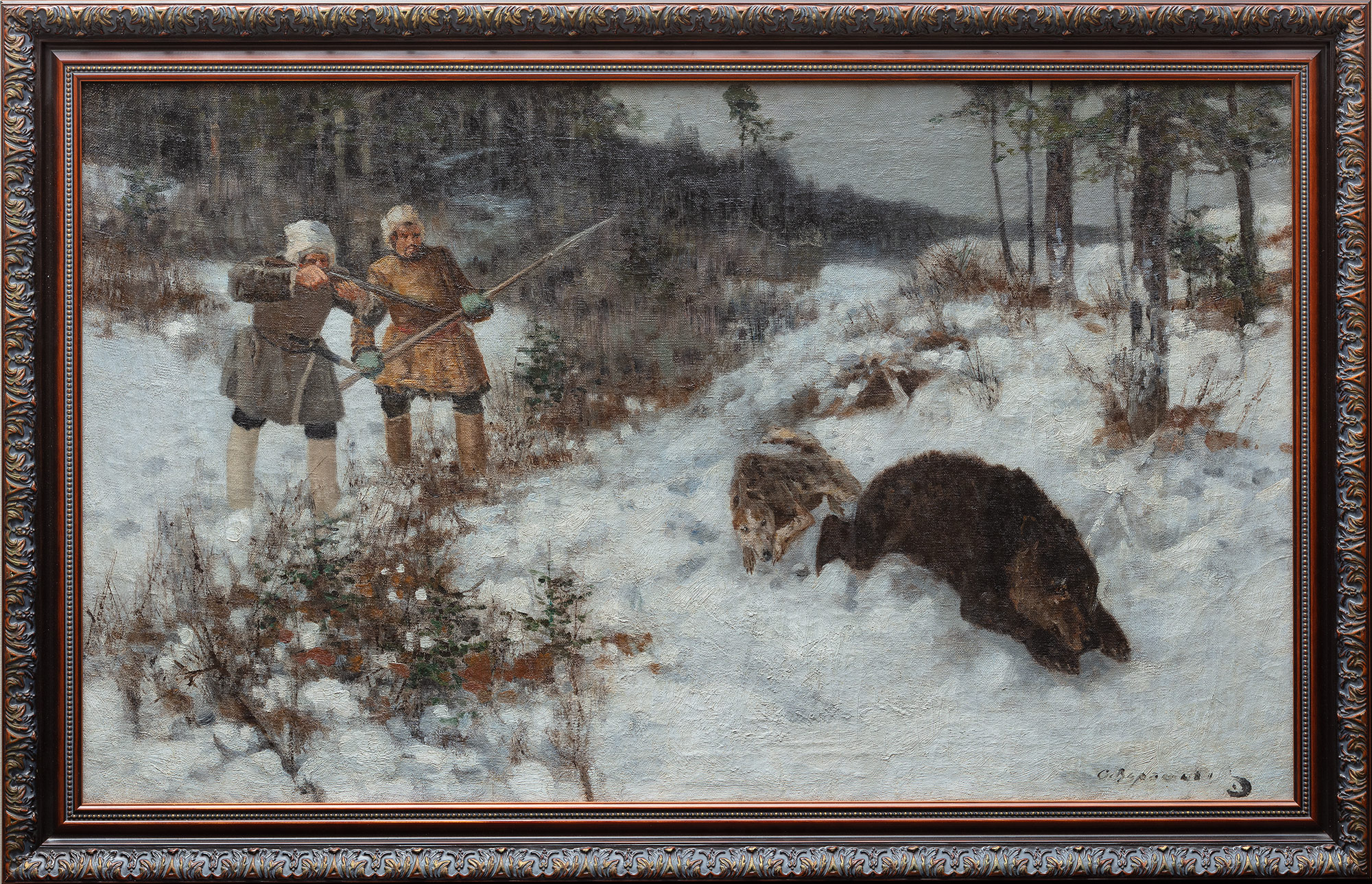 Среди самых разных «охотничьих» композиций С. С. Ворошилова нередко встречаются и сюжеты зимней охоты на медведя. Картину «Охота на медведя зимой» можно отнести к эталонным работам художника, экспонировавшимся на выставках и публиковавшимся в популярных иллюстрированных журналах конца XIX — начала XX века.