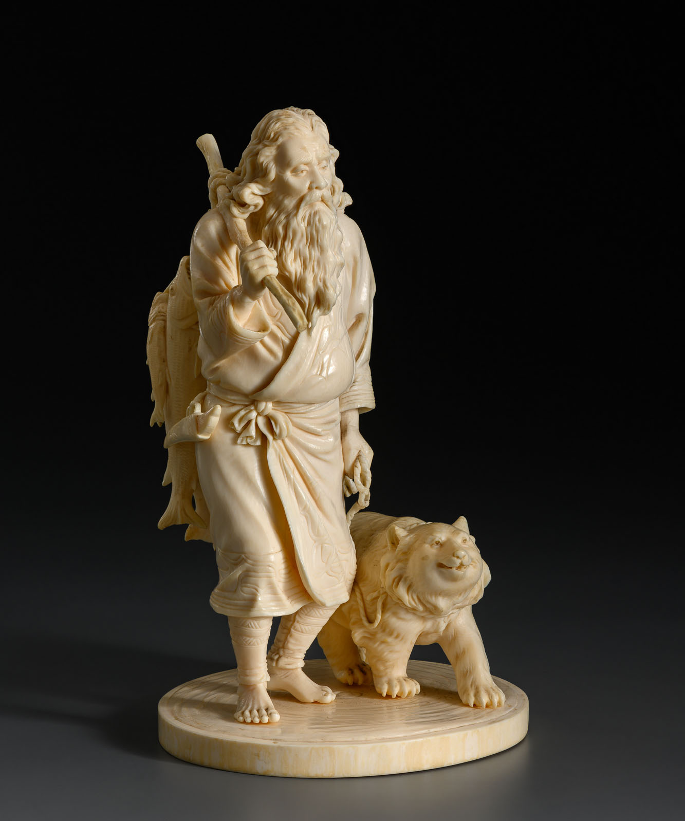 Снизу подставки выгравированы два иероглифа «芳一», которые читаются как «Хоити». Вероятнее всего, это подпись мастера Като Хоити / Ёсикадзу (яп. 加藤 芳一), члена Токийской ассоциации скульпторов с 1904 по 1906 год. Токийская ассоциация скульпторов (Токё Тёкокай) — организация, существовавшая в Токио с 1890 по 1923 год и объединявшая большое количество профессиональных резчиков. Организация занималась развитием искусства резьбы по слоновой кости, а также продвижением работ ее членов, обменом навыками и идеями.