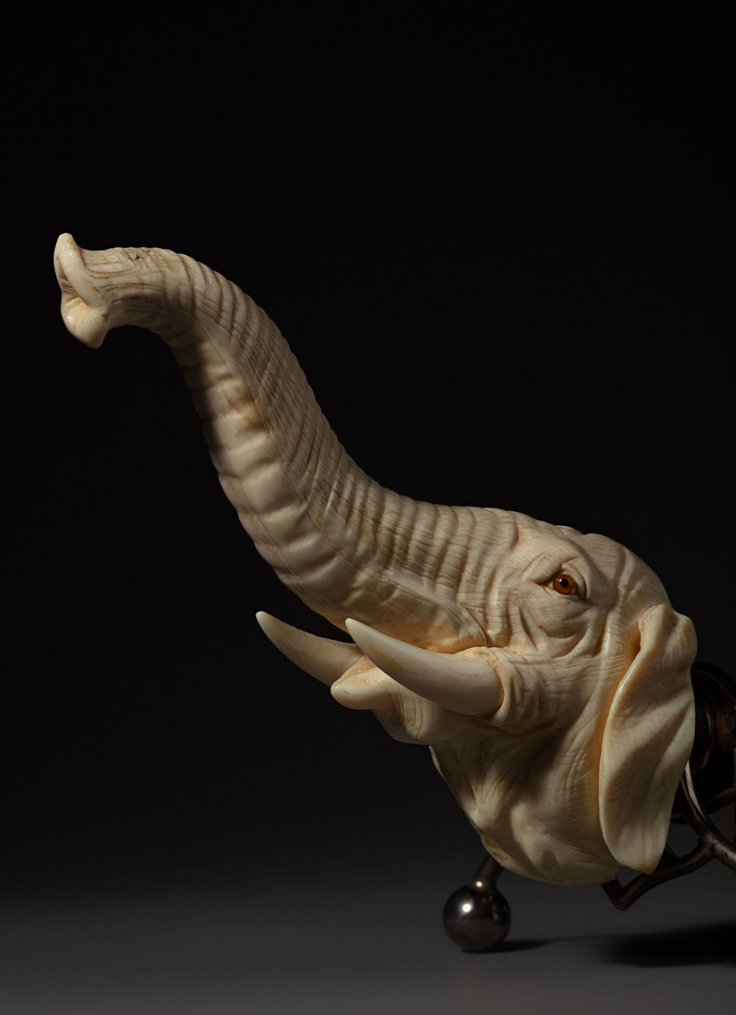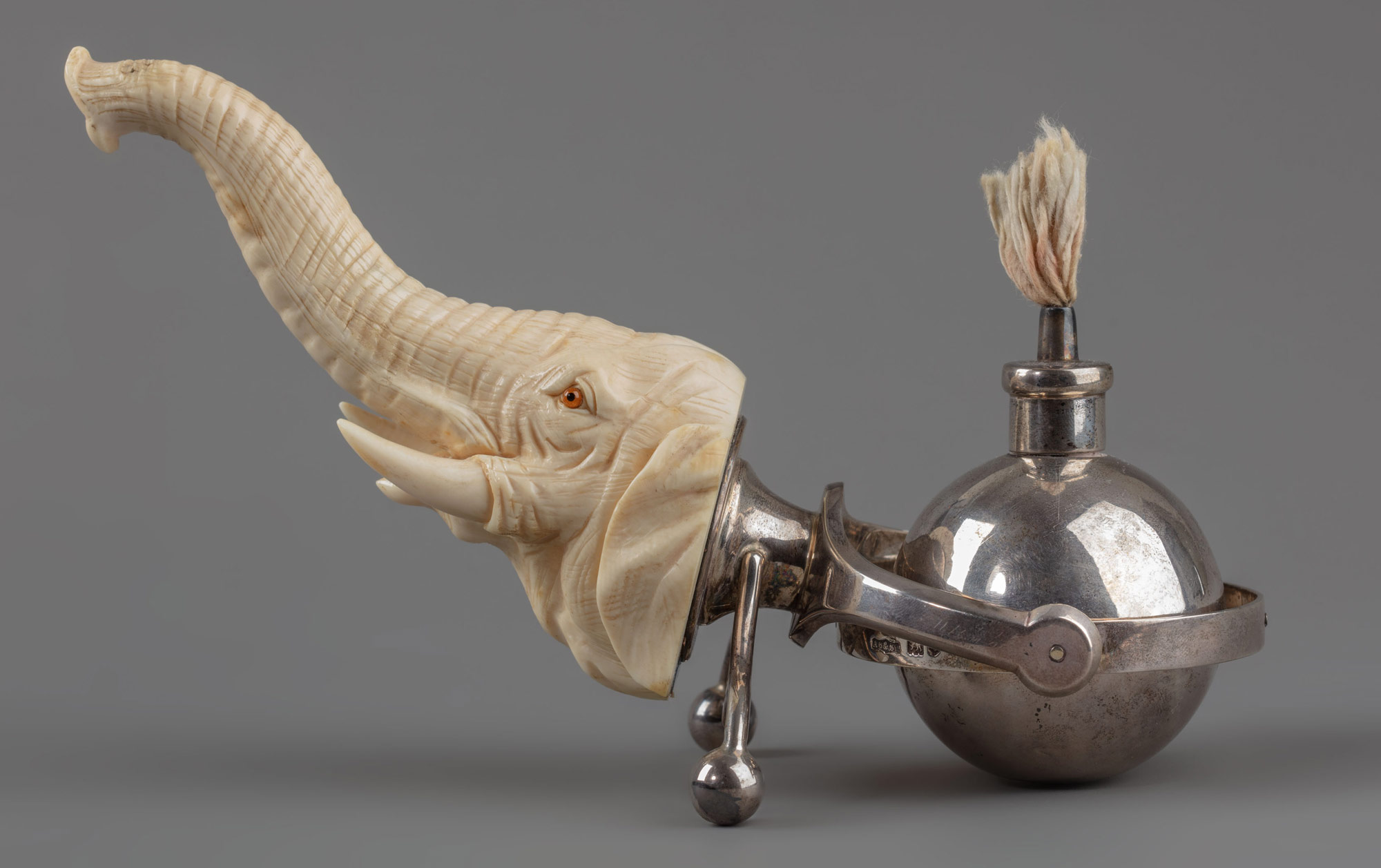Серебро 925-й пробы, штамп, гибка, слесарная работа, зеркальная полировка, общая сборка; слоновая кость, резьба; стекло (глаза слона); фитиль из растительных волокон