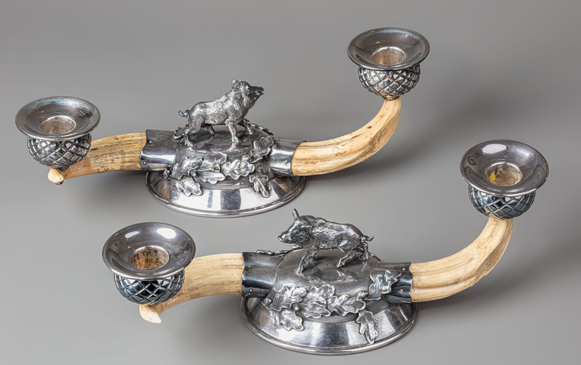 Великолепные комнатные парные подсвечники на две свечи на круглой выпуклой подставке со скульптурным изображением кабана в окружении дубовых веток, выполненные из полированного серебра с использованием острых клыков дикого кабана, выполняют одновременно практические и символические функции. Клыки кабана традиционно считаются ценным трофеем, символизирующим доблесть, силу и мастерство охотника. Использование их в серебряных подсвечниках позволяет эстетично украсить обстановку кабинета городской квартиры или интерьер загородного дома в охотничьем стиле. Кроме того, вещи с художественно-дизайнерским включением клыков этого сильного и агрессивного животного в свою композиционную структуру наделялись с древних времён магическими свойствами. В разных культурах они использовались как амулеты и обереги, защищающие от злых сил и дающие владельцу мужество и неуязвимость, энергию защиты и успеха. Исходя из имеющихся на серебряных подставках пробирных клейм и маркировки фирмы-производителя, подсвечники датируются периодом 1950–1960‑х гг. и относятся к заказной эксклюзивной работе немецкой ювелирной фирмы «Кох и Бергфельд» (Koch & Bergfeld) в Бремене.