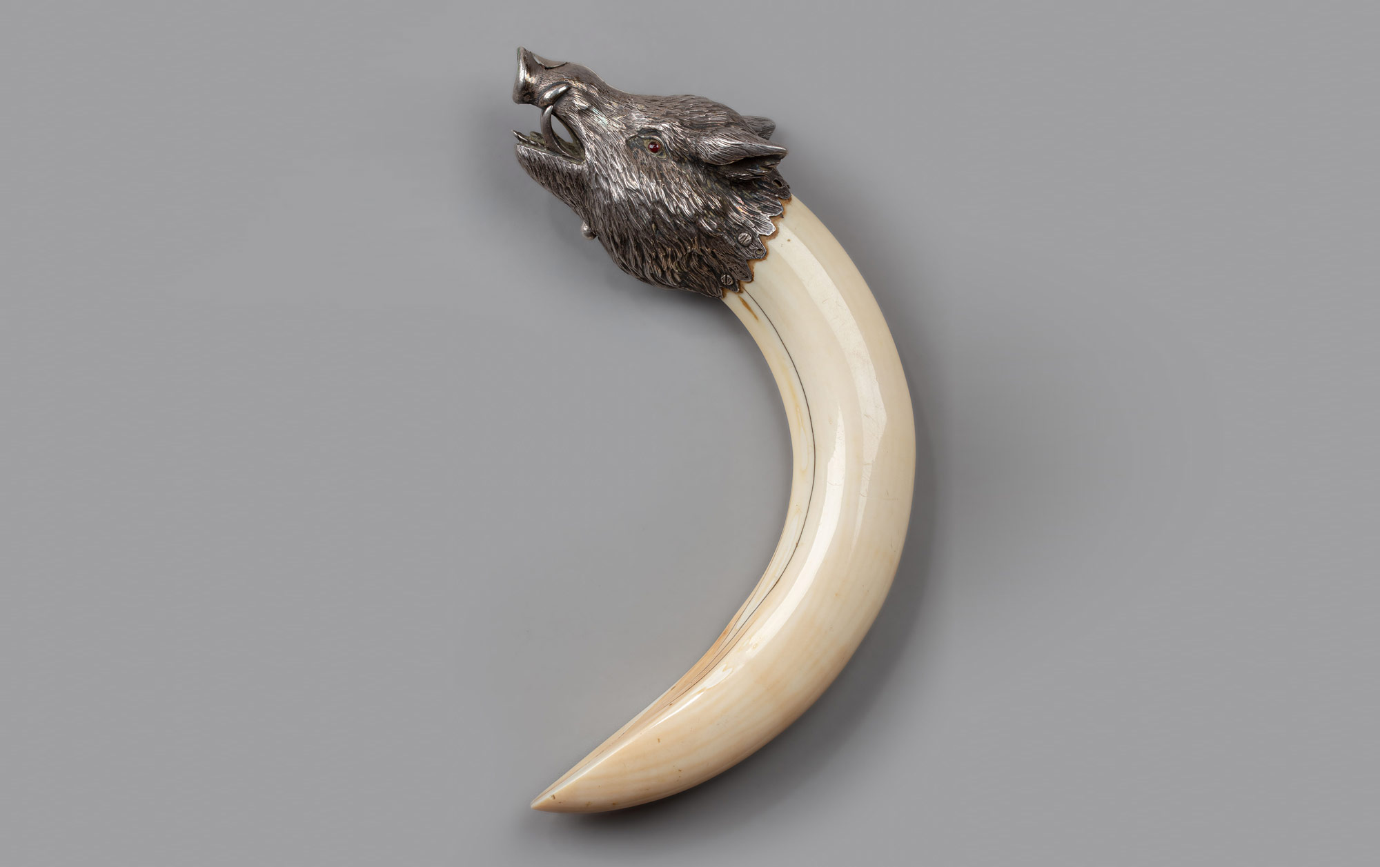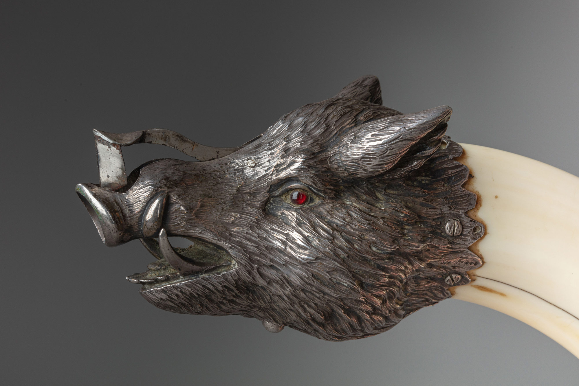 Старинный нож для сигар (др. назв. — каттер, гильотина для сигар) с эффектным серебряным навершием в виде головы кабана выполнен из натурального клыка кабана дугообразной формы, что позволяет ему удобно ложиться в ладонь мужской руки. Такие ножи в России назывались сигарными гильотинами и являлись обязательными инструментами для обрезания запечатанного кончика разнообразных сигар, что обеспечивало хорошую тягу и возможность наслаждения вкусом и ароматом табака с первых затяжек и впоследствии на протяжении всего процесса курения. Стальное лезвие гильотины и круглое отверстие для вставления сигары находится спереди на кончике морды кабана, спусковой механизм гильотины в виде кнопки расположен с внешней стороны в нижней челюсти кабаньей головы. Подобного рода оригинальный и дорогой по материалу (кость и высокопробное серебро) изготовления аксессуар, необходимый для правильного курения сигар, свидетельствует о дизайнерской разработке предмета и его предназначении для элитарного покупателя. На серебряном навершии сигарной гильотины в виде клыкастой головы кабана имеются немецкие ввозные пробирные клейма и клеймо-именник знаменитого австрийского ювелира, владельца фабрики драгоценных аксессуаров повседневного быта в Вене — Георга Адама Шайда (1837–1921). Специализацией его фабрики были портсигары, пудреницы, письменные приборы, туалетные наборы, шкатулки для украшений, государственные награды Австрии и др., которые шли в большом количестве на экспорт в Германию, Францию, Италию, Бельгию, Англию и Испанию. На всех этих изделиях рядом с ввозными клеймами стран-получательниц драгоценного товара обязательно имелось в той или иной модификации клеймо фабрики Г. А. Шайда в виде инициалов его имени — G. A. S.