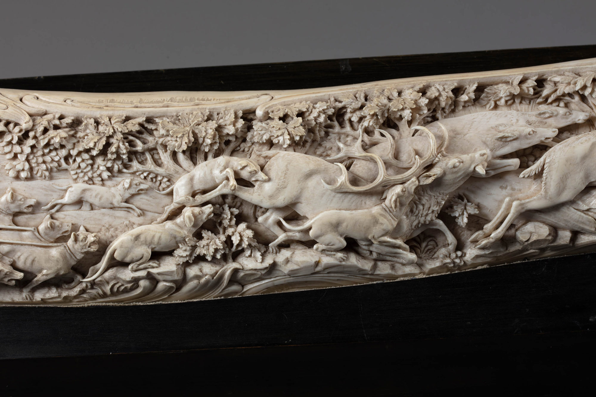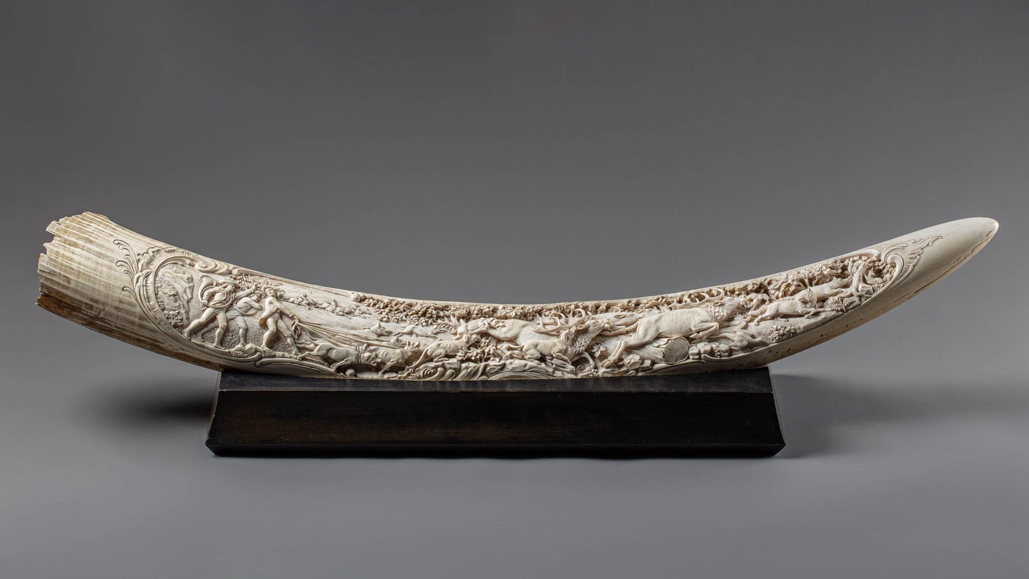 Резные бивни слона использовались в европейском искусстве, художественном деле и домашнем интерьере в трёх вариантах: цельные или резные бивни на подставках, интерьерная миниатюрная пластика и нэцкэ, инкрустация мебели и декоративной скульптуры. Рассматриваемый резной бивень относится к самому престижному и эксклюзивному варианту использования слоновой кости, главная цель которого — создать в повседневном быту человека благородную красоту повседневности. Бивень сохраняет свою естественную изогнутую форму и с лицевой стороны покрыт сплошной панорамной рельефно-плоскостной и горельефной резьбой на тему псовой охоты на оленей (chasse à courre). Судя по одежде пеших и конных персонажей, их аксессуарам и изображённым диким животным, ищущих спасения от собак в лесной чаще, перед нами классическая европейская парфорсная охота XVIII в. В неорокайльном картуше, обрамляющем по всей длине рога охотничью композицию на переднем плане слева представлены два егеря-трубача и псарь со сворой английских гончих собак (стегхаундов), пять из которых он удерживает на поводке, остальные псы спущены и начали травлю стремительно убегающих оленей, из‑под ног которых во все стороны из кустов вспархивают испуганные фазаны. На втором плане за спинами трубачей и псаря с собаками на фоне восходящего солнца показаны азартно мчащиеся на лошадях охотники. В сужающейся правой части бивня изображены убегающие две лисы и старое сломанное дерево с играющими на нём белками. Очень натуралистично обозначен снизу позём композиции, в котором хорошо узнаются камни, трава, кусты, маленькие деревца, старый поваленный ствол дерева. Сверху над сценой травли оленей раскинулась пышная крона дубов и других деревьев. Визуальная динамика композиции, подробная в своей детализации сцена начавшейся на рассвете нового дня парфорсной охоты, все её персонажи — охотники, собаки, олени — показаны с большим знанием этой сферы человеческой деятельности, аристократического хобби и конного спорта. Тончайшая моделировка всего антуража охотничьей сцены в сложнейшей технике художественной резьбы по кости, верно передающей психологию и дух парфорсной охоты, делает это изделие немецких косторезов подлинным произведением декоративно-прикладного искусства своего времени, не потерявшего свою актуальность и в наши дни. Такие предметы обычно располагаются в парадной жилой зоне на каминных полках, массивных комодах или в специальных нишах с подсветкой.