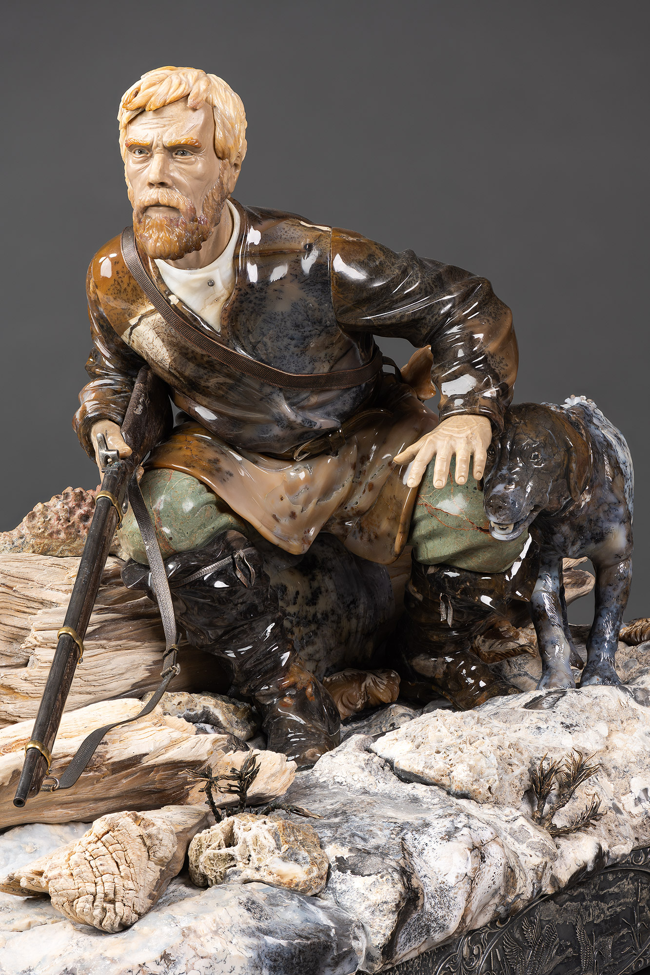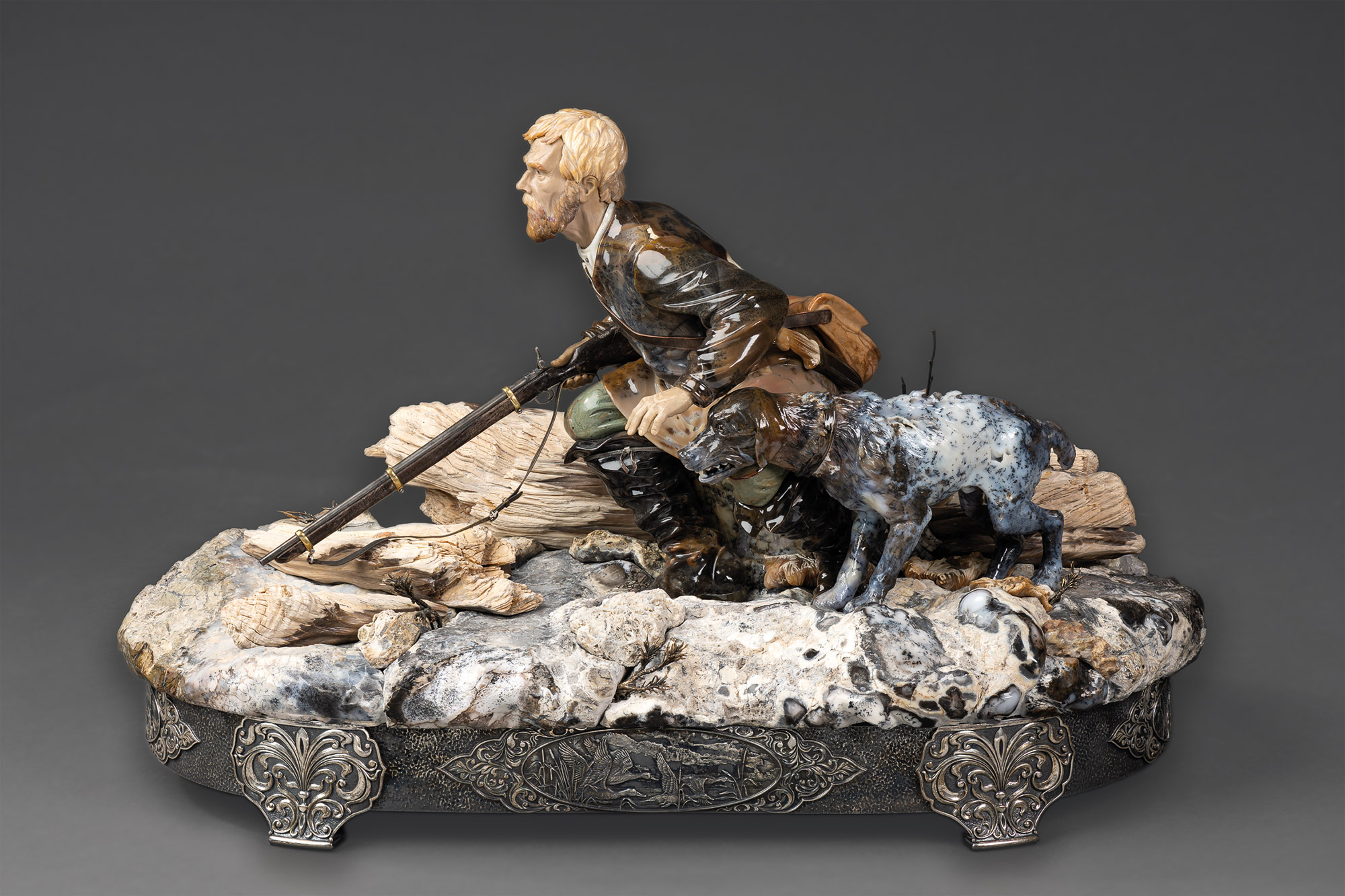 На овальной, с зернистой поверхностью, металлической подставке с четырьмя овальными медальонами с рельефным изображением пернатой дичи в камышах и накладными ножками с симметричным растительным орнаментом — фигура сидящего на стволе упавшего дерева светловолосого мужчины с бородкой, в стилизованном охотничьем костюме XIX века с длинноствольным ружьём в правой руке. У левого бока — фигура стоящей длинноухой собаки из минерала с пятнистым рисунком серо-голубых и коричневых тонов. В сложной по построению и цветовому решению композиции запечатлён момент напряжённого ожидания, подчёркнутый рельефностью вен на руке и неподвижностью пальца на курке ружья, позой готовой к поиску легавой. Повышенное внимание уделяется деталям костюма и особенно снаряжения. Тщательно воспроизводится внешний вид ружья, патронташа, кинжала в ножнах, ягдташа. Впечатление достоверности достигается благодаря грамотному подбору минералов, адекватно передающих фактуру и текстуру исходных материалов: дерева, кожи, металла, текстиля, шерсти животного.