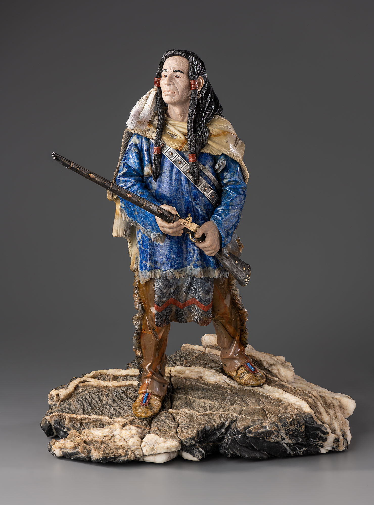 Индеец, всматривающийся вдаль и сжимающий в руках ружье, — это собирательный образ отважного охотника и следопыта, знакомый всем по приключенческим романам Ф. Купера и классическим вестернам. Подставка скульптуры представляется настоящей скалой, с которой герой обозревает окрестности.