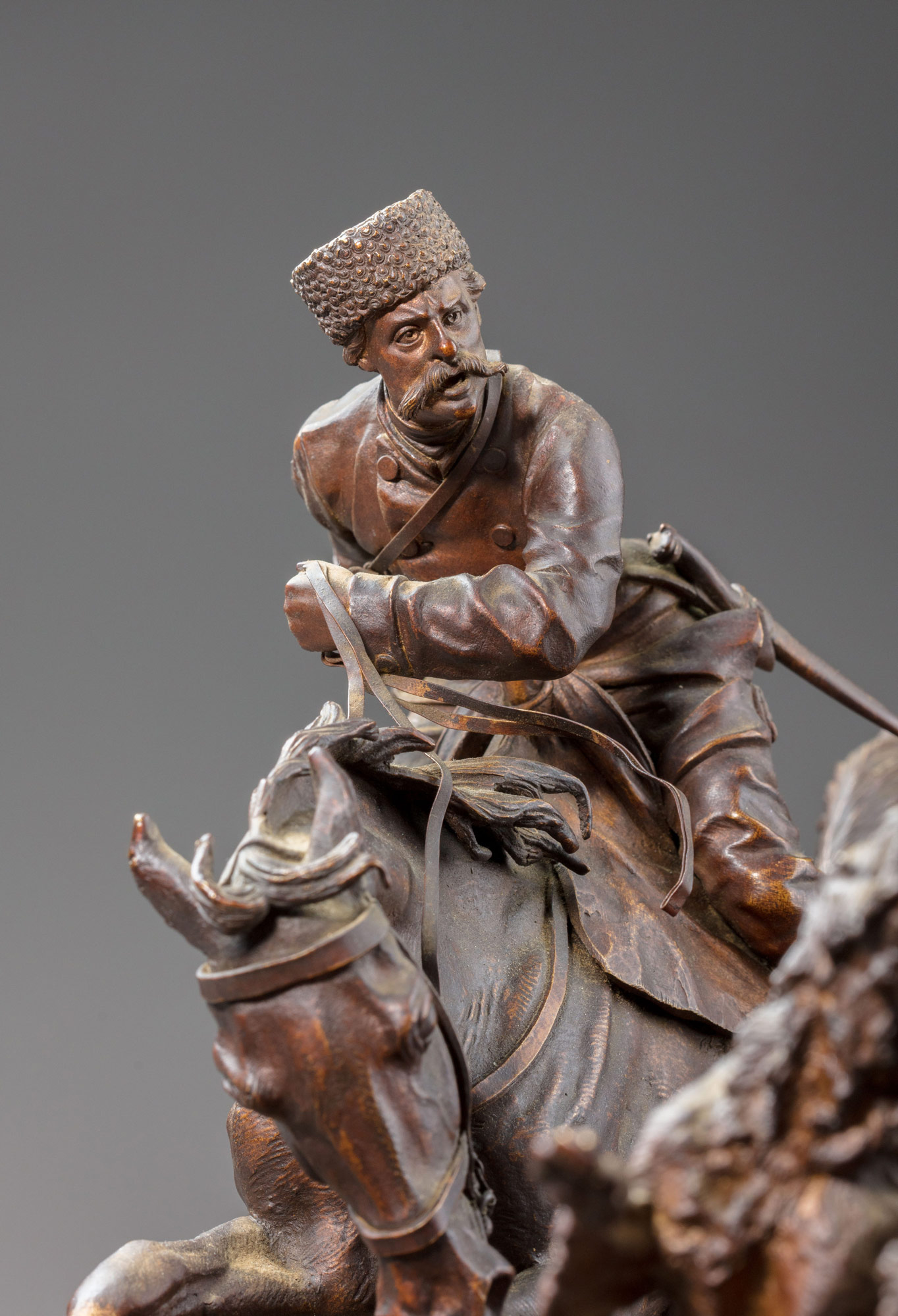 Скульптурная композиция «Охота на волка с борзыми» (или «Травля волка») на овальной подставке с позёмом в виде неровной земли с растительностью, сучьями, остатками корней считается классическим образцом знаменитой русской кабинетной бронзы посл. четв. XIX в. Автором оригинальной модели является известный санкт-петербургский скульптор Н. И. Либерих, которого сегодня считают жемчужиной русской скульптуры, так как он обладал большой самобытностью и разработал уникальный стиль, в котором сплелись воедино традиции академической художественной школы и глубокого понимания природы. Например, в представленной композиции, посвящённой охоте на волка, автор очень реалистично и живо передаёт динамику жанровой сценки: затравленного и сильно измученного борьбой хищного зверя, всё ещё огрызающегося на бегу и готового к яростной схватке за свою жизнь, стремительно мчащегося на лошади охотника, настёгивающего хлыстом свою резво мчащуюся лошадь, практически настигших волка двух борзых собак, которые готовы схватить свою добычу. Художественной особенностью этой достаточно крупной интерьерно-кабинетной бронзовой скульптуры является редкое для русского бронзолитейного дела двухцветное патинирование коричневого цвета. В отличие от французской декоративной скульптуры с полихромным патинированием, в русской бронзовой пластике втор. пол. XIX в. присутствовало монохромное патинирование коричневого цвета, т. к. цветовая полихромия патинирующего покрытия внешней поверхности скульптуры значительно повышала её стоимость для покупателя. Скульптурная композиция с показом конной охоты на волка с борзыми собаками выполнена на высоком художественно-техническом уровне и обладает прекрасной сохранностью. Работа имеет полную сигнатуру клейма — фабричное клеймо производителя и фамилию автора скульптурной модели, что позволяет абсолютно точно её датировать 1880‑е — 1893 гг., подтвердить Н. И. Либериха как автора данной композиции на тему охоты и отнести отливку к заказной продукции фабрики К. Ф. Верфеля.