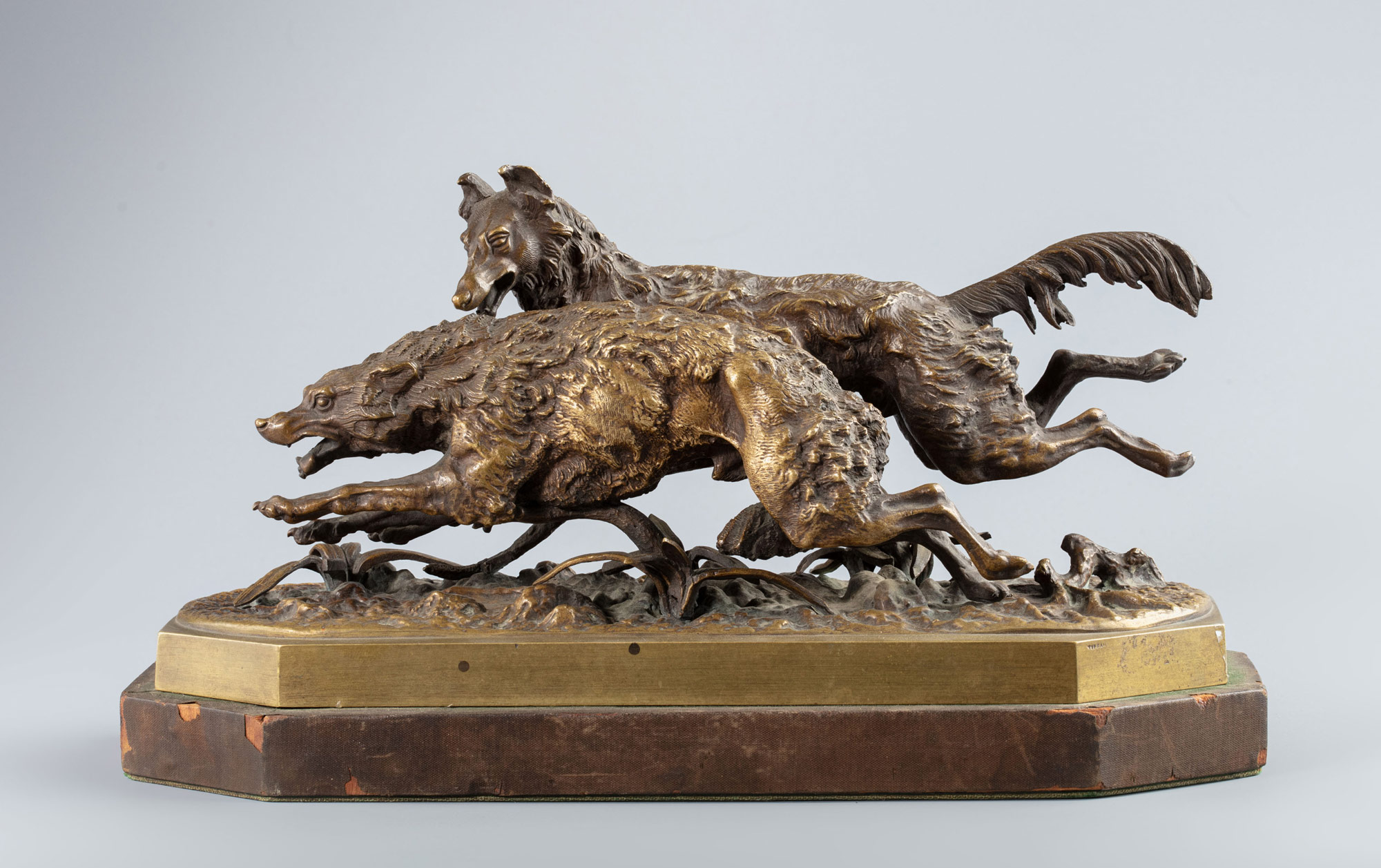Данная скульптурная работа в патинированной бронзе анималистического характера, показывающая финальный этап псовой охоты на волка с борзой собакой, является фрагментарной частью широко известной бронзовой скульптуры «Охота на волка с борзыми» (или «Травля волка») интерьерного значения знаменитого русского столичного скульптора Н. И. Либериха. Скульптурная композиция «Охота на волка» показывает бегущего из последних сил огрызающегося волка и настигшую его охотничью собаку (борзую), пытающуюся схватить зверя за холку и остановить бег дикого животного до подхода охотника. Подставкой служит 8‑ми гранное бронзовое основание с позёмом, имитирующим неровную лесную почву с кустами травы и остатками корней. Скульптура дополнительно установлена на незакреплённый деревянный постамент аналогичной 8‑ми гранной формы с зелёной бархатной подложкой изнутри и с оборота.