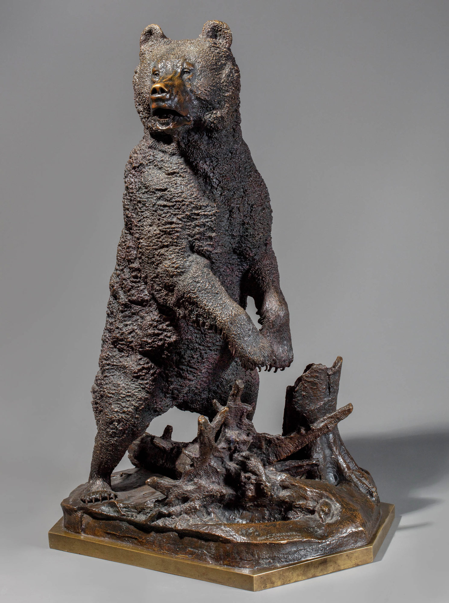 На представленной бронзовой отливке стоящего перед вывороченным корневищем дерева фигуры огромного медведя отсутствует планка-шкала с соответствующей надписью, не наблюдаются и следы её крепежа, торец постамента скульптуры имеет неповреждённую патину и гладкость внешней поверхности, что позволяет говорить, что эта деталь была сознательно снята перед отливкой предмета из соображений политкорректности. Идеальный европейский уровень художественно-технического литья скульптуры, плотная и добротная полихромная патина, небольшое исправление в надписи перед фамилией скульптора Либериха и главное отсутствие шкалы-линейки с напоминанием об охотничьей удали русского императора (основная патриотическая идентификация этой работы) позволяет атрибутировать эту отливку как работу парижских бронзолитейщиков пер. трети XX в. Хорошо зная русскую скульптурную пластику из бронзы по экспозициям русских отделов на Всемирных выставках в Париже в 1867, 1878, 1889 и 1900 годах, крупные бронзовые фабриканты Братья Сюсс имели большое желание отливать оригинальную и неизбитую в своей жанровой тематике камерную бронзу по моделям прославленных русских скульпторов. Так было со скульптурами Е. А. Лансере, которые отливались по его вывезенным во Францию оригинальным моделям на парижском предприятии Братьев Сюсс в 1900–1930-е гг., так могло произойти и с моделями Н. И. Либериха, выкупленных и привезённых в Париж теми же Сюссами после закрытия в 1914 г. предприятия К. Ф. Верфеля, где эти модели хранились.