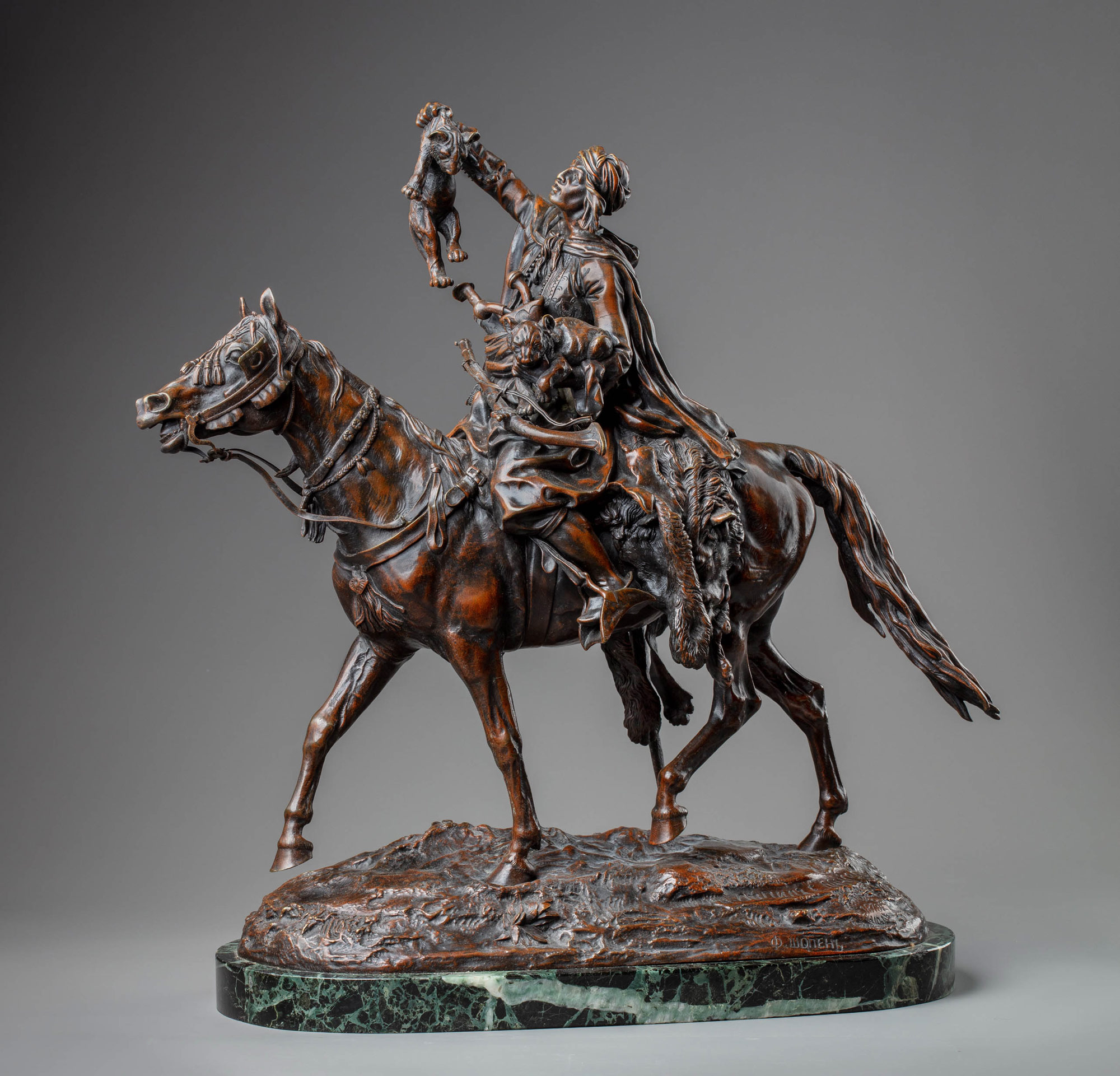 Одна из очень редких и уникальных для российского антикварного рынка бронзовых скульптурных композиций «Конный араб со львятами» (или «Возвращение со львиной охоты») на овальной подставке с позёмом в виде неровной каменистой почвы, отлитая из патинированной бронзы и установленная на мраморный постамент чёрно-зелёного цвета с белёсыми вкраплениями и прожилками, отлитых на крупнейшем бронзолитейном заводе «Братья Сюсс» в Париже по оригинальной модели «Конный араб со львятами» 1879 г. знаменитого санкт-петербургского скульптора-прикладника Е. А. Лансере. В его творчестве эта модель считается одной из самых монументальных и зрелищных образов, отражающих его интерес к восточной тематике и этнографии. После закрытия в 1902 г. в Санкт-Петербурге широко известной и лучшей в русской бронзолитейной промышленности фабрики художественной бронзы Феликса Шопена, многие хранящиеся в модельном кабинете фабрики оригинальные модели Е. А. Лансере были куплены и увезены во Францию успешными парижскими фабрикантами и бронзолитейщиками братьями Сюссами. Их целью было наладить у себя на производстве художественное литьё скульптур и пластических композиций из патинированной бронзы по оригинальным моделям широко известного на Западе скульптора Е. А. Лансере, которого они по-видимому рассматривали не только как самого талантливого русского художника в бронзолитейной отрасли, но и как своего исторического соотечественника на русской земле, имевшего французское происхождение.