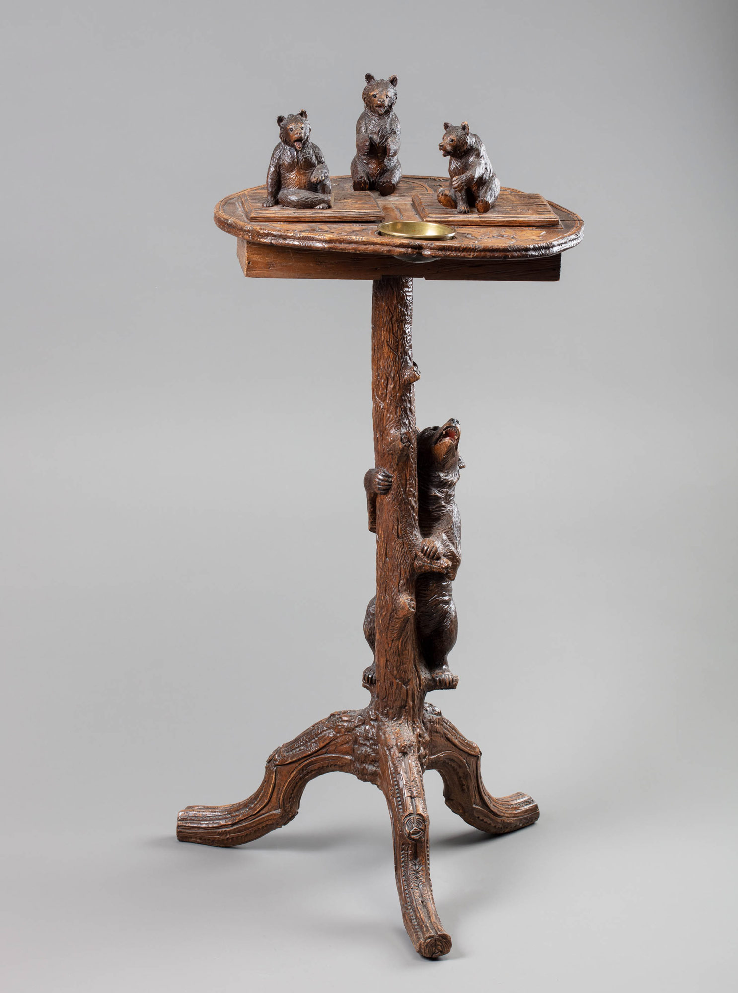 Этот курительный столик с великолепно выполненной резьбой прекрасно показывает талант и мастерство резчиков по дереву, принёсших небольшой швейцарской деревне Бриенц мировую известность. Возникший в начале XIX века неповторимый стиль художественной обработки дерева впервые был оценён по достоинству на Всемирной выставке в Лондоне в 1851 году. При поддержке правительства в 1884 году в Бриенце открылась школа резьбы по дереву, существующая до сих пор. Благодаря совершенствованию техники и системному обучению к концу XIX столетия резные изделия из Альпийского предгорья стали считаться эталоном художественной обработки дерева. Мебель этого стиля, получившего название «Шварцвальд», с тонкой работой и натуралистичным изображением животных и растений, произвела фурор на Парижской Всемирной выставке 1900 года. Мастера из Бриенца продемонстрировали зрителям удивительную резную мебель, в частности — необычные столы и скамьи в виде медведей. Экспонаты с этой выставки сейчас украшают один из залов Федерального дворца в Берне. Представленный столик изготовлен именно в тот период, когда слава мастерских Бриенца достигла пика популярности. Главная особенность такой мебели — филигранная и сложная резьба, воспроизводящая образы альпийских животных (оленей, сов, кабанов) и окружающих природных элементов (плющ, дубовые и кленовые листья). Наибольшее распространение получил образ медведя — эмблемы кантона Берн, в который входит Бриенц. Его нередко изображают в динамичных позах: играющим, карабкающимся или отдыхающим. Медведь может выступать элементом мебели — например, служить основанием для скамьи, подставки для зонтов или стола. При создании курительных столиков нередко использовали сцену с медведицей и медвежатами.