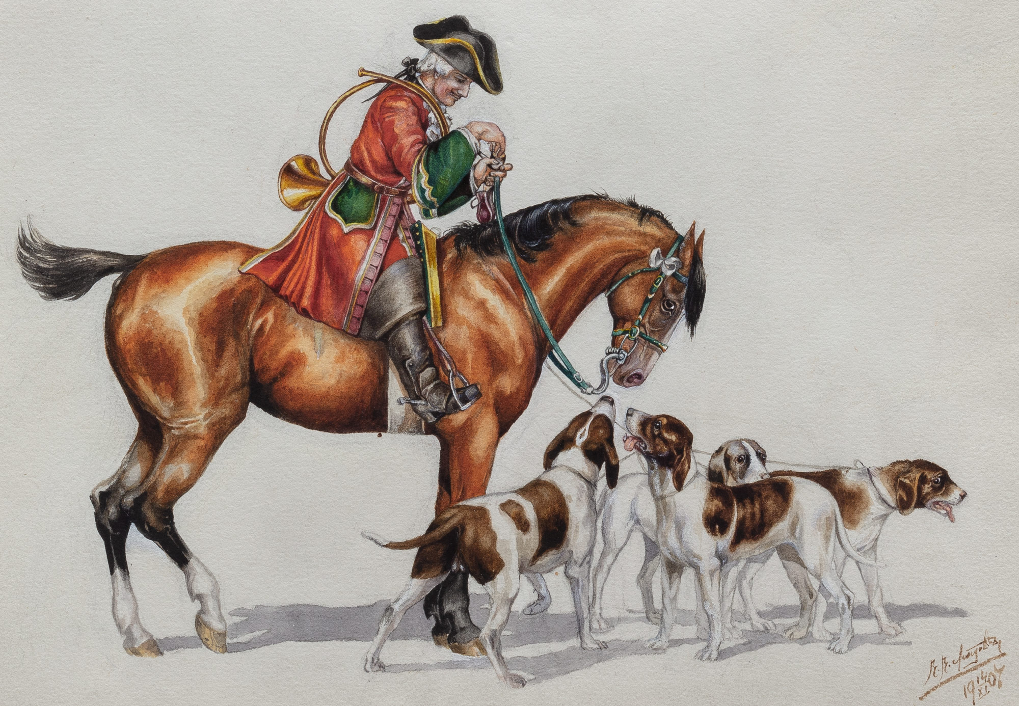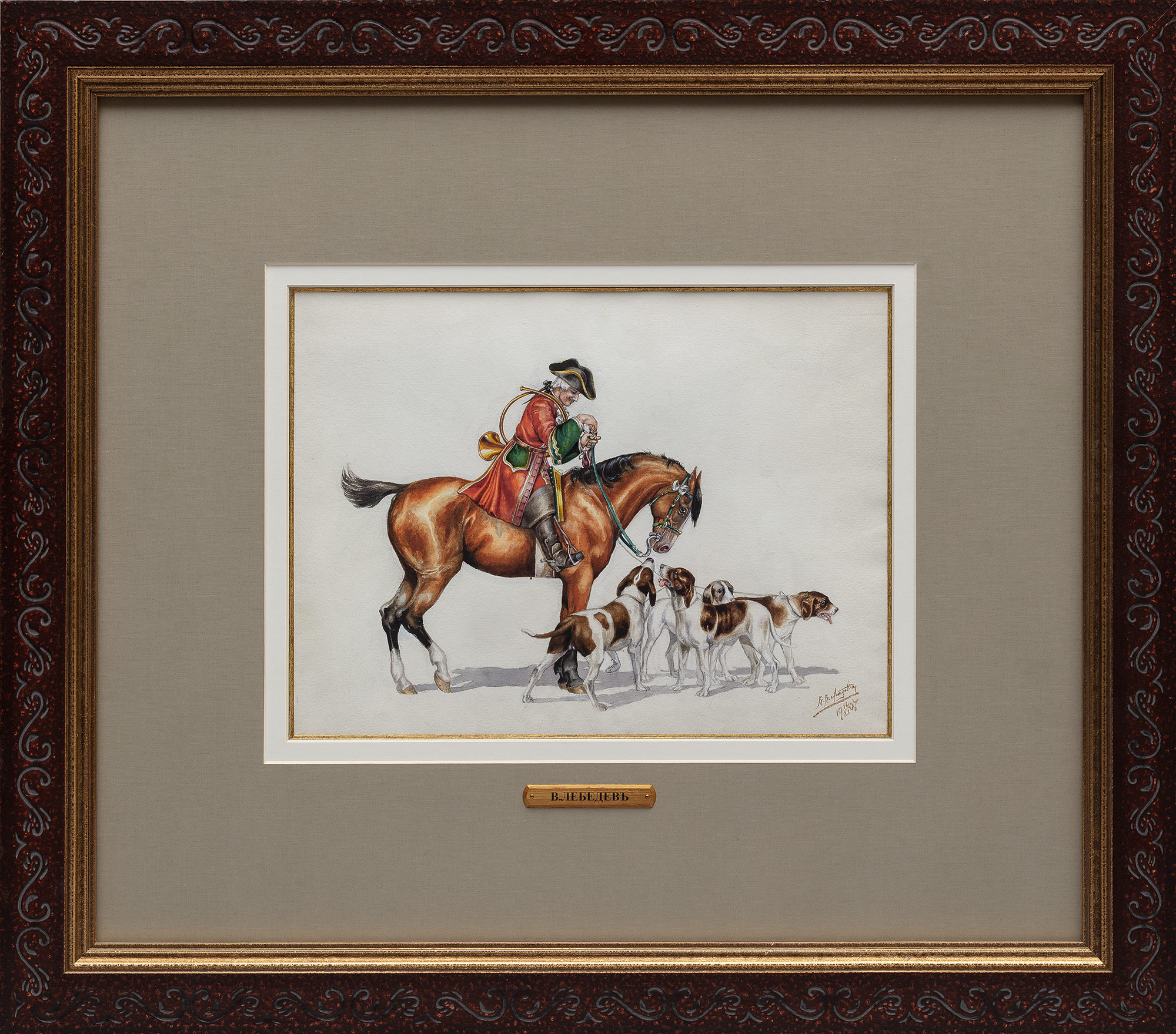 На акварели «Охотник, набивающий трубку» изображён момент возвращения с охоты. Лошадь с понурой головой, у её ног — загнанные гончие с высунутыми языками, охотник расслабленно набивает трубку. С большим мастерством изображены лошадь и собаки. Композиция относится к ранним произведениям В. В. Лебедева, редко появляющимися на антикварном рынке.