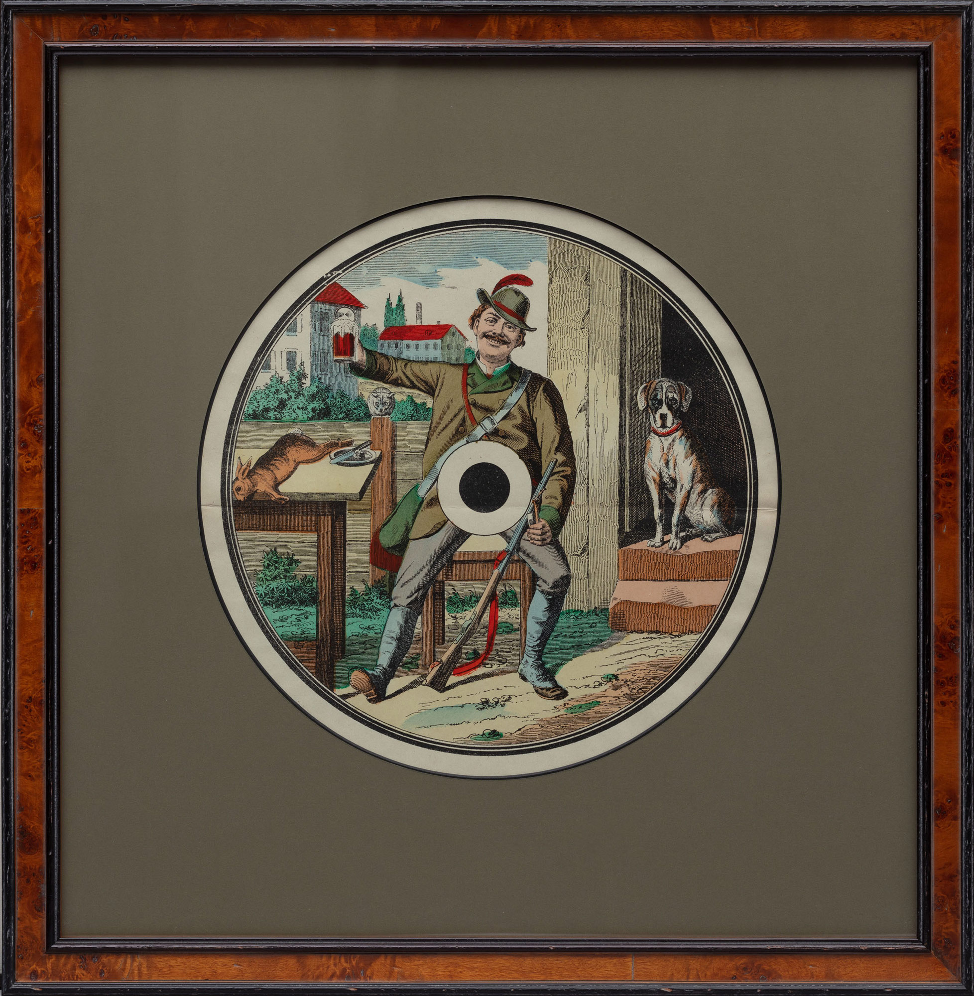 «Охотник с трофеем» представляет охотника с пивом в отличном настроении, рядом — верный пёс, у ног — ружьё, на столе — убитый заяц, охотничий трофей.