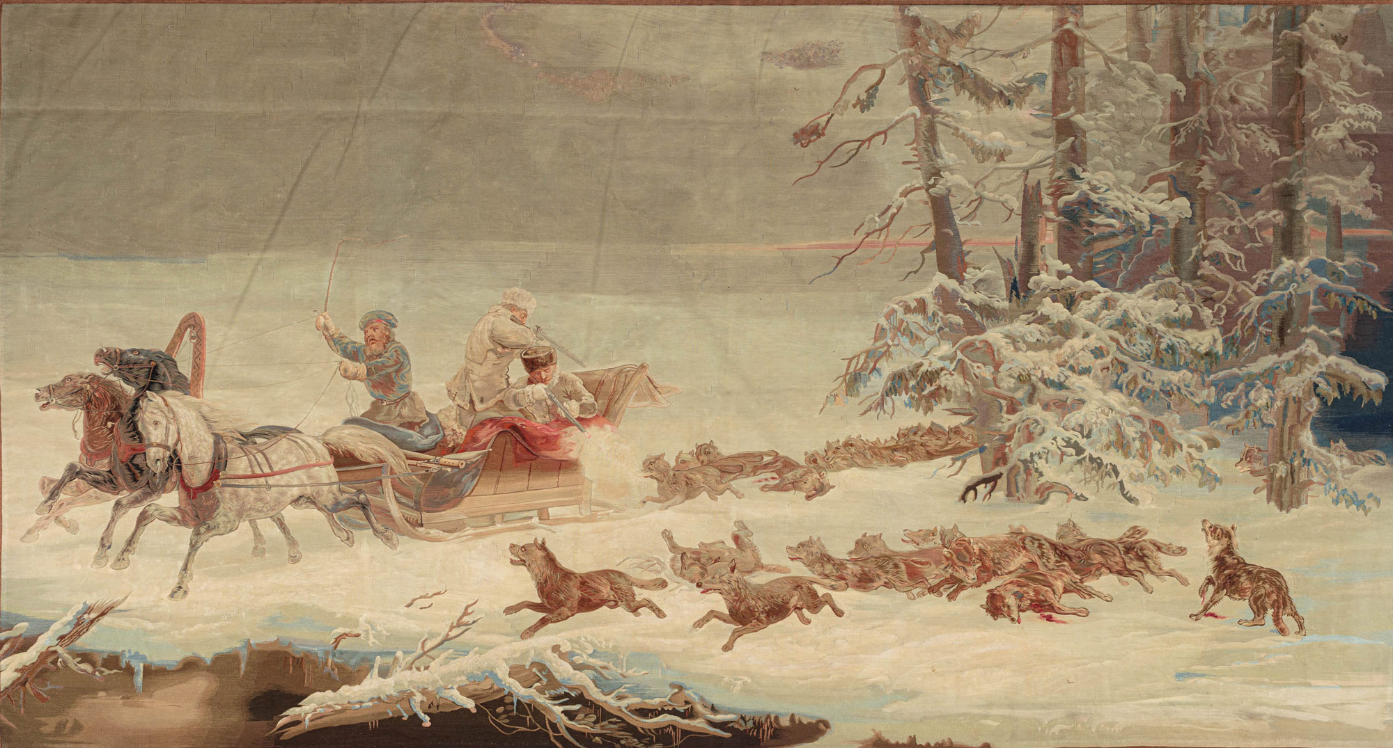 На шпалере представлен зимний пейзаж с динамичной композицией несущейся тройки, преследуемой стаей волков. Сани только что выехали из сурового, густого, заросшего тёмного леса с засыпанными снегом мощными деревьями, где, вероятно, началась погоня. Два охотника в санях отстреливаются, уже ранив и метко свалив наповал нескольких волков из стаи. Перепуганный возница, правя лошадьми, отчаянно хлещет кнутом. Скачущая во весь опор тройка испуганных лошадей уже, кажется, устремилась за пределы ковра. Однако на пути их может ждать опасность — вероятно, они движутся к краю обрыва. Висящие над кручей мощные стволы сломанных деревьев изображены на переднем плане слева.
