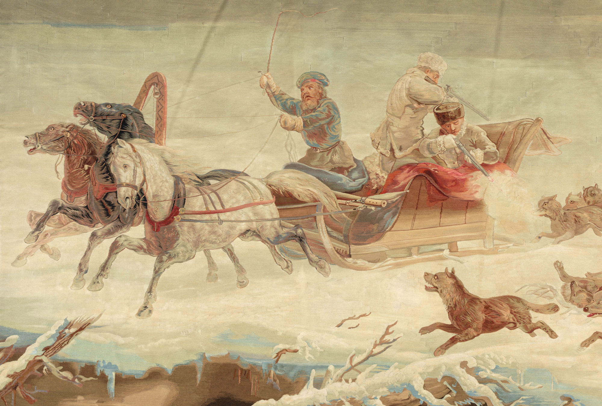 Композиции со скачущей тройкой были одним из излюбленных сюжетов художников во второй половине XIX в. Тройка стала культурным символом России, источником вдохновения для поэтов и композиторов. В данном случае можно предполагать, что живописное полотно, послужившее основой для шпалеры (безворсового настенного ковра), было индивидуальным заказом. Об этом свидетельствует множество деталей.