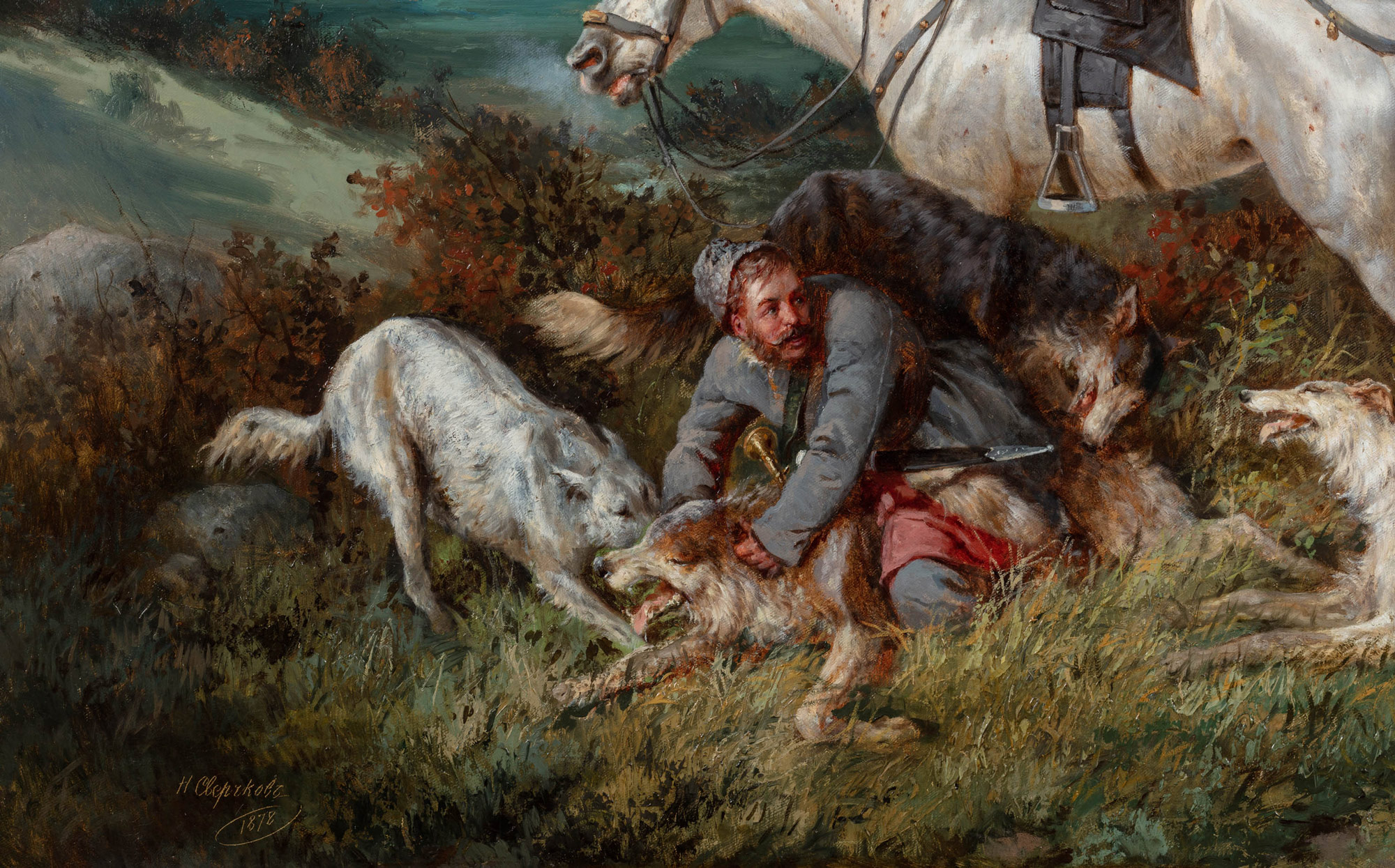 Картина «Охота на волка», по всей видимости, была написана по заказу известного московского фабриканта и коннозаводчика Митрофана Сергеевича Мазурина (1834–1880), владельца Реутовской мануфактуры. Композиционное и художественное решение полотна близко к более ранней работе живописца (1873 г. Петрозаводск, Музей изобразительных искусств Республики Карелия).