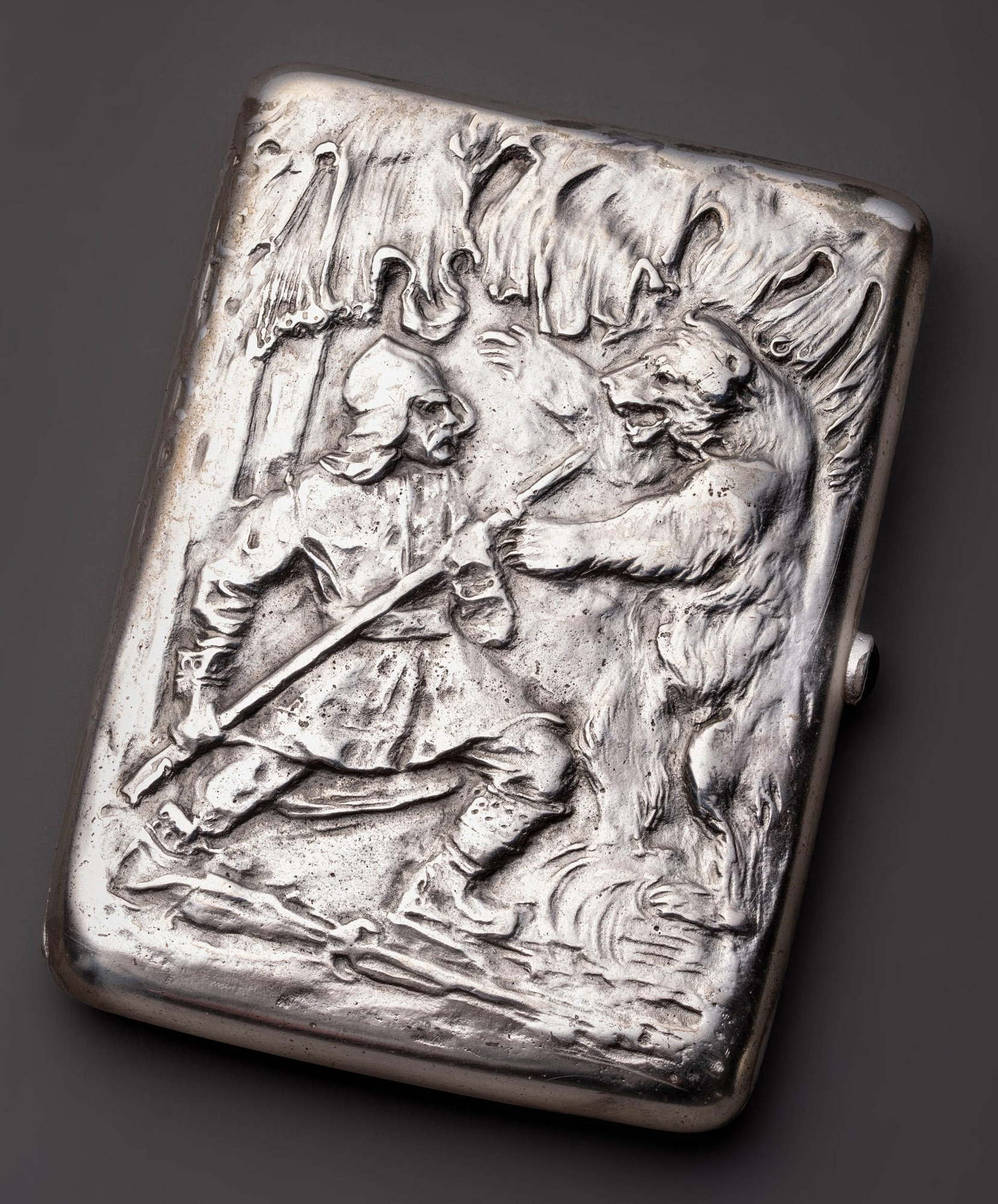 Портсигар прямоугольной формы с рельефным штампованным декором на крышке в виде жанровой сценки в неорусском стиле. Изображена традиционная русская охота на медведя с рогатиной (тяжёлое копьё с длинным, широким и острым наконечником), охотник облачён в старинные одежды XVI–XVII вв. В России такая охота была известна со Средневековья и практиковалась вплоть до конца 1920‑х годов. Поединок считался проверкой мужества; например, цари Иван Грозный и Михаил Фёдорович Романов были любителями «медвежьей потехи» — боя охотника с медведем на огороженной площадке. Когда медведь поднимался на дыбы и бросался на человека, охотник упирал тупой конец древка в землю (или в ногу) и направлял остриё в грудь или под лопатку зверя. Медведь под тяжестью собственного веса насаживался на рогатину. Главной задачей охотника было удержать древко и не дать зверю смять себя. Кабошон замочка-защёлки — светло-фиолетового цвета, под аметист.