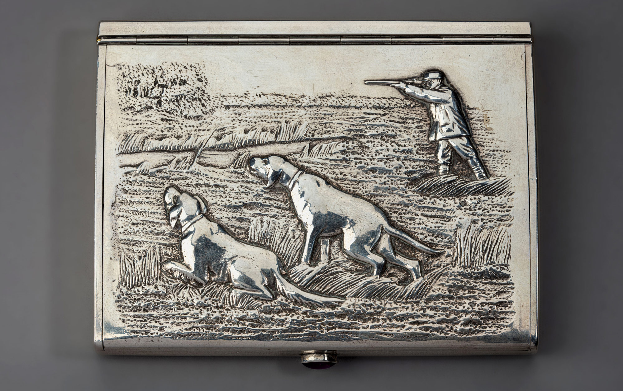 Портсигар в форме плоской прямоугольной коробочки с открывающейся на петлях верхней створкой, в центре нижней створки устроен замочек-защёлка, украшенный фиолетовым кабошоном из ювелирного стекла. На верхней створке рельефное изображение охотничьей сценки: на болоте с высокой осокой показан охотник, стреляющий из ружья уток и неподалёку от него две собаки-пойнтера на стойке, высматривающие добычу.