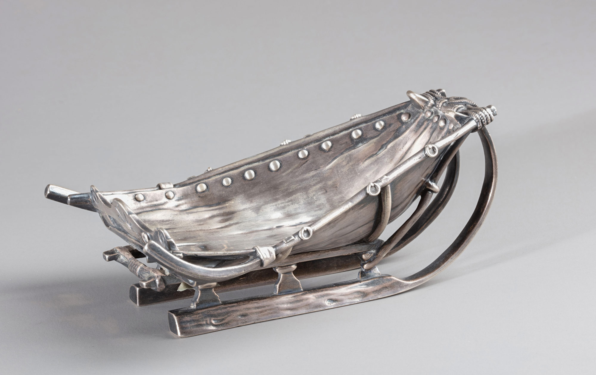 Пепельница «Сани-розвальни» из оксидированного серебра является модным и чрезвычайно популярным кунштюком1 московской ювелирной промышленности сер. XIX в., имевшим самое широкое распространение в быту высших и состоятельных слоев русского городского населения. Выполненная в раннем «русском стиле», серебряная пепельница достаточно натуралистично и точно передает внешний вид деревянных саней (фактура дерева, ткани/кожи, веревок и пр.) с сохранением всех конструктивных особенностей этого повсеместно распространенного крестьянского вида зимнего транспорта. Сделанная мастерами знаменитой московской ювелирной фирмы «Сазиков» (период управления семейным ювелирным делом И. П. Сазиковым, сыном основателя фирмы П. Ф. Сазикова) на волне зарождающегося в русском декоративно-прикладном искусстве «русского стиля» данная пепельница породила ряд подражаний в других материалах. Эта удачная и удобная модель очень важного утилитарного предмета для домашней курительной комнаты или рабочего мужского кабинета отливалась не только в серебре, но и в позолоченной и посеребренной бронзе на фабриках Москвы и Санкт-Петербурга и в чугуне на Каслинском заводе Южного Урала.