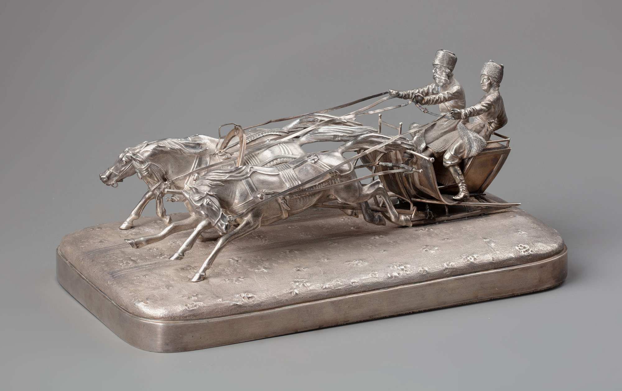 Скульптурная композиция «Тройка» выполнена в «русском стиле» и относится к работе мастеров петербургского филиала знаменитой московской фирмы «Сазиков» в период ее управления Игнатием Павловичем Сазиковым, сыном Павла Федоровича Сазикова, основателя московской мастерской ювелирного дела и магазина серебряных изделий в 1810 г. Жанровая композиция представляет типичную бытовую сценку из русской жизни: выездные городские сани с двумя седоками, запряженные тройкой лошадей, стремительно мчатся по зимнему насту с наезженной колеей. В санях изображены два сидящих ямщика в теплой зимней одежде и барашковых шапках: старый с окладистой бородой и усами правит коренником и пристяжными, молодой паренек – помогает удерживать поводья одной из пристяжных лошадей. Позём подставки имитирует неровное снежное покрытие проезжей дороги.