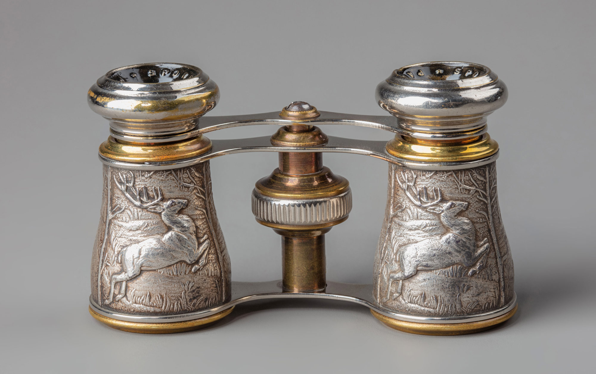 Внешняя поверхность бинокля декорирована по посеребренным корпусам выдвижных окуляров рельефной охотничьей сценкой: на фоне леса стремительно мчащийся олень с большими ветвистыми рогами и бегущая по его следу свора охотничьих собак. На бинокле имеется маркировка изготовителя Sportiere Paris — торговая марка фирмы по производству высококачественной оптики (биноклей для скачек и охоты, мощных военных полевых и морских биноклей марки Field & Marine, театральных стёкол opera glasses), которые производились во Франции в конце XIX — начале XX в. Предмет представляет собой классический образец французских биноклей модели Jockey Club, пик популярности которых пришёлся на кон. XIX — нач. XX в. Название модели связано с престижным парижским «Жокей-клубом» (осн. 1834 г.), который объединял высшее общество Франции и курировал вопросы коннозаводства. Многие изделия фирмы Sportiere Paris отличаются художественным оформлением, наиболее часто встречаются корпуса биноклей с рельефными изображениями на металле сценок охоты (напр. на оленя с собаками, как в этом случае), а также птиц и цветочных мотивов. В наши дни бинокли Jockey Club ценятся преимущественно как антикварные и коллекционные объекты, имеющие свой особый художественный облик. При этом они остаются функциональными, но уступают современным оптическим приборам по кратности увеличения и светосиле, используясь скорее как статусный аксессуар и предмет исторической реконструкции, напоминая об эпохе викторианской Англии.
