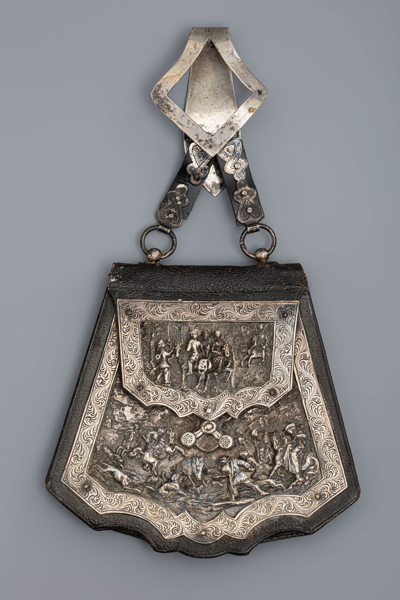 Кошелёк-сумочка закрытого типа трапециевидной формы из натуральной кожи тёмно-коричневого цвета, складывающаяся «гармошкой», на одно отделение, с шёлковой фиолетовой подкладкой внутри, с откидной крышкой, закрывающейся на металлический внешний замочек (клапан) и с ручкой-шлейкой из кожи и металлическим пластинчатым держателем для крепления на поясном ремне. Все металлические детали декоративной отделки кошелька-сумочки посеребрённые. Сюжетом жанровых сценок в обоих случаях является французская конная охота на кабана в лесных королевских угодьях эпохи Людовика XV: конные охотники и егери во французских костюмах XVIII в., собирающиеся на охоту (на крышке сумки), те же охотники и егери с ружьями и сворой охотничьих собак в лесной чаще в процессе охоты; на переднем плане — кабан, затравленный собаками, и собака, раненная кабаном.