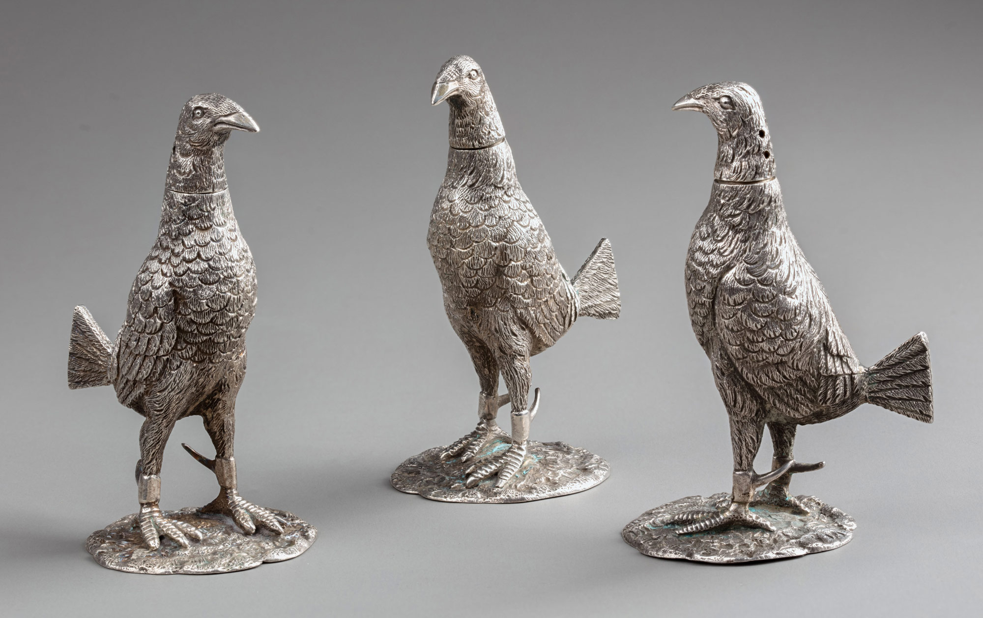 Представленные серебряные предметы в форме фигурок птиц из стерлингового серебра 925 пробы выполнены в технике литья по выплавляемой модели. Это декоративные и одновременно функциональные изделия, которые использовались как оригинальные столовые приборы – перечницы, что подтверждается наличием отверстий сверху на шейках всех птиц. Каждая фигурка представляет собой спокойно стоящую и выпрямившуюся вверх птицу, самца, из породы «серых куропаток» с детализированным оперением и ручной доработкой для придания им реалистического вида и хорошей узнаваемости. Все птицы имеют съемные притертые головки и расположены на круглых пластинчатых подставках с позёмом в виде лесной почвы. На ногах куропаток надеты шпоры, которые изначально отсутствуют в природе этих птиц, что свидетельствует о том, что показаны птицы, предназначенные для птичьих боев. «Серые куропатки» и их близкие сородичи исторически использовались для проведения такого рода азартных игр, хотя эта практика была менее распространена, чем знаменитые петушиные бои, считавшиеся «королевским спортом» в Англии. Король Генрих VIII (1491–1547) даже построил специальную арену «Cockpit-in-Court» на ул. Уайтхолл, в центре Лондона. Считается, что традиция птичьих боев зародилась в Юго-Восточной Азии, где изначально в поединках могли участвовать не только петухи, но также куропатки и перепела. Самцы «серых куропаток» в естественных условиях проявляют высокую агрессию и отвагу при защите территории или потомства, в брачный период они устраивают ожесточенные стычки между собой. Именно эти качества сделали их объектом интереса для подобных зрелищ, которые были популярны среди всех слоев английского населения.