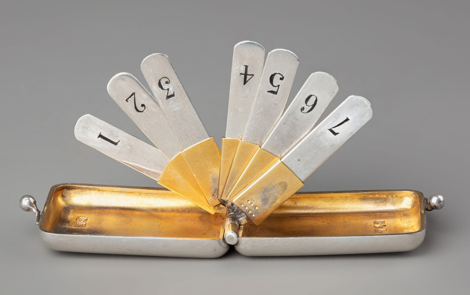 Данная «веерная коробка» выполнена из стерлингового серебра 925 пробы и представляет собой небольшой изящный прямоугольный футляр с откидной на петле крышкой с маленькой щеколдой-запором и крепежным колечком на торце корпуса. Внутри серебряный футляр позолочен и содержит 8 жетонов в виде тонких прямоугольных пластинок слоновой кости с выгравированными номерами от 1 до 8. На лицевой стенке футляра гравированная монограмма «BLS», очевидно означающая имя владельца, руководителя охоты или распорядителя. Использование таких аксессуаров для жеребьёвки является не только частью охотничьей этики, но и залогом безопасности на охоте, когда распорядитель точно знает, какой охотник находится на каждой позиции, что критически важно для соблюдения секторов обстрела и координации общих действий.