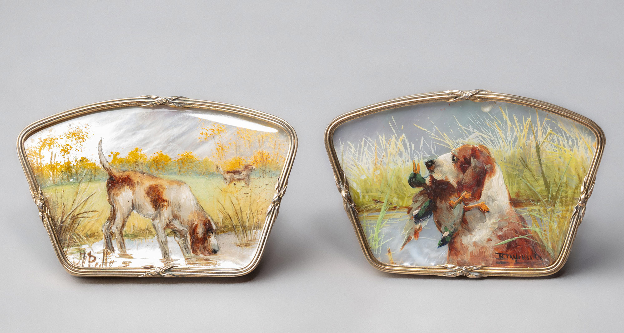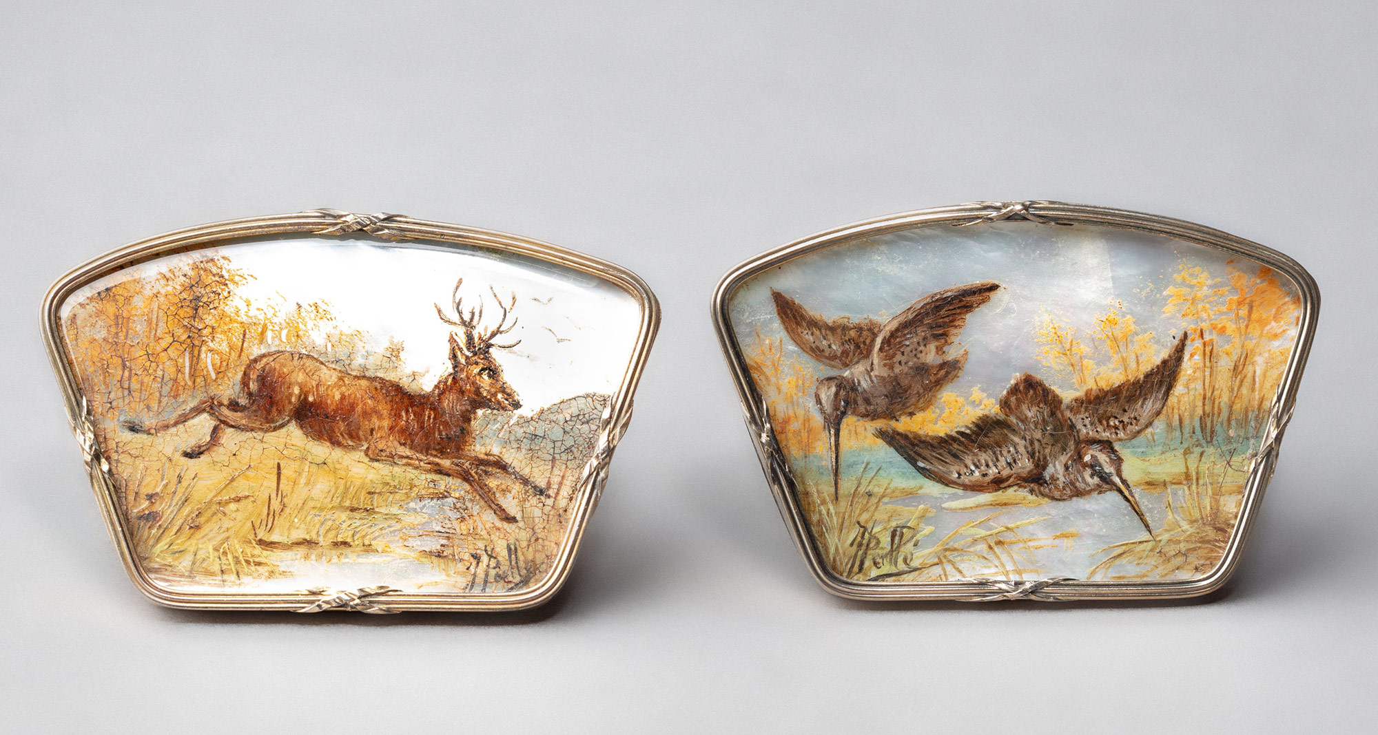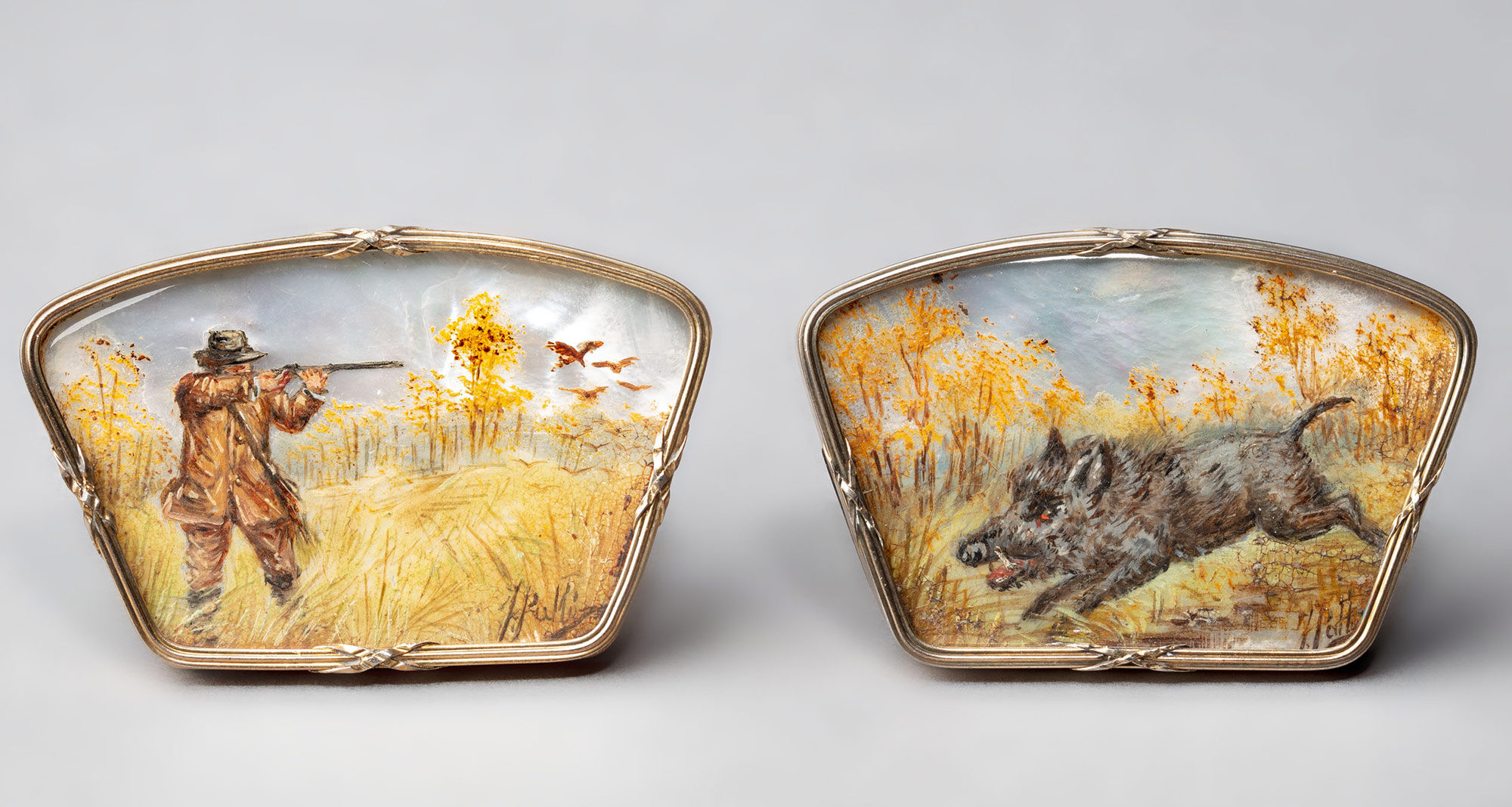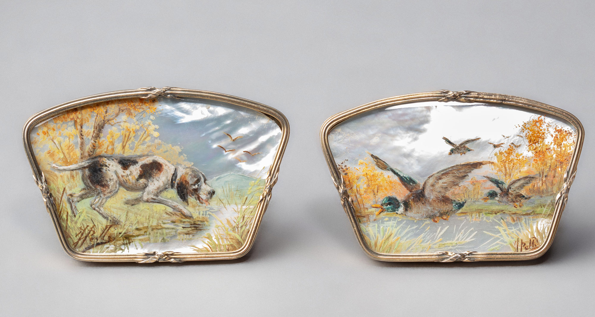 Драгоценные подставки-держатели для карточек рассадки с именами гостей в нач. XX в. были изысканным элементом сервировки праздничного стола, отражающим эстетику европейского модерна (Art Nouveau). Также считается, что подобного рода предметы могли одновременно использоваться как подставки под меню. Подставки-держатели разложены в упаковочной коробке в гнезда желтого бархатного ложемента в 4 параллельных ряда по 3 предмета в каждом ряду. Каждая подставка-держатель представляет из себя миниатюрную перламутровую пластину, вставленную в сплошной позолоченный серебряный футляр с кармашком и 2 ножками-упорами сзади. На каждой перламутровой пластине живописные изображения охотничьей тематики: охотник, стреляющий уток; сеттер с уткой в зубах у водоема; взлетающий фазан на фоне леса; бегущий сквозь лесную чащу кабан; пойнтер, пьющий воду из озера; бегущий олень с ветвистыми рогами; стоящий на опушке леса олень-самец; взлетающие над озером утки; взлетающие над озером два вальдшнепа; пойнтер, лезущий в озеро за добычей; две куропатки на опушке леса; взлетающий над озером селезень. Все живописные сюжеты имеют в нижнем левом/правом углу авторскую метку, на подставке-держателе с взлетающим над озером селезнем имеется авторская подпись художника «Dupont».