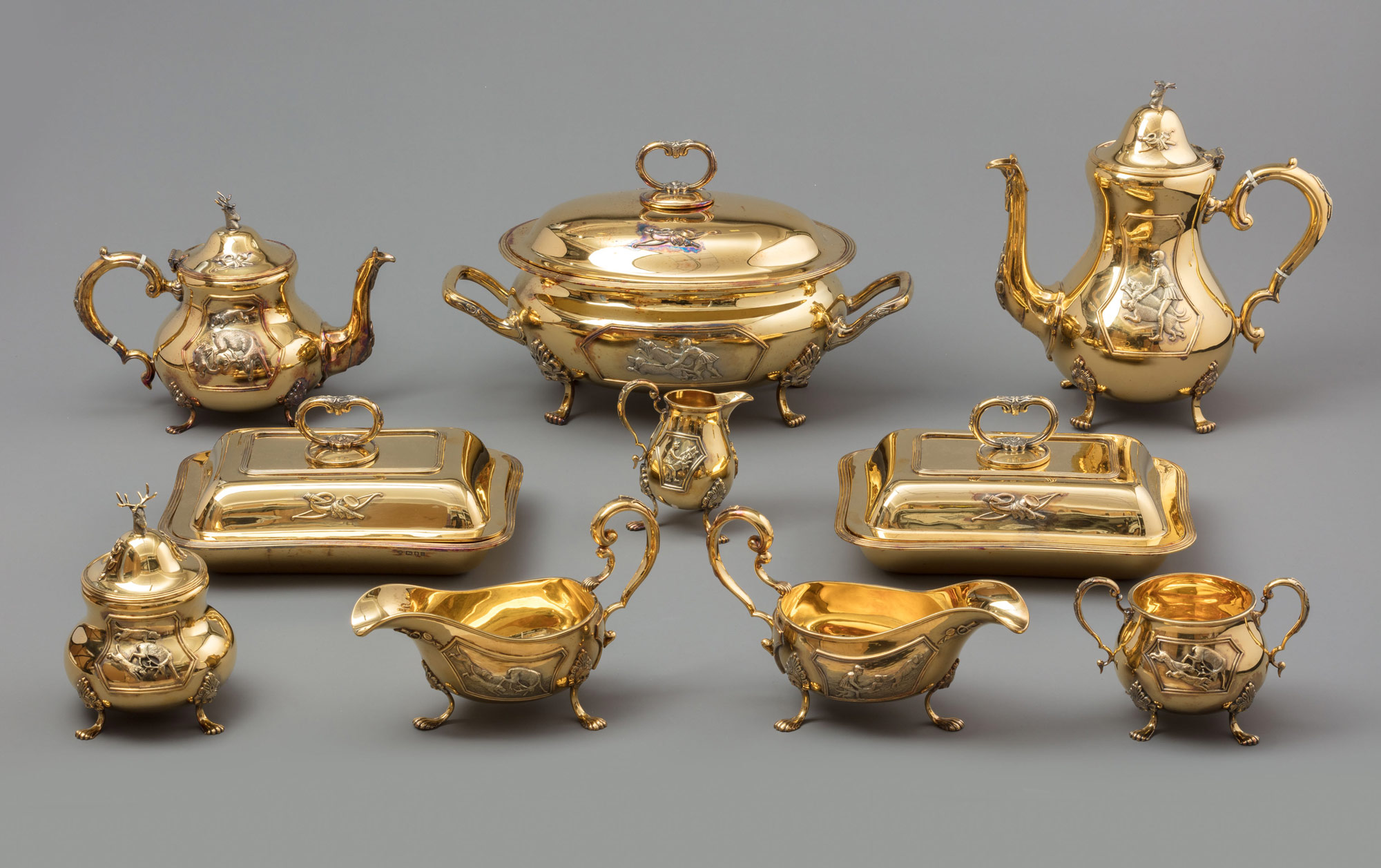 Чайно-столовый сервиз «Охотничий» из позолоченного серебра, включающий 10 предметов на высоких ножках-лапках, с рельефно-накладным и скульптурным декором на тулове, ручках, носиках, крышках и ножках всех изделий. Сервиз включает в себя: чайник заварочный и чайник для кипятка (или кофе), сахарница (без крышки), вазочка с крышкой для сластей (варенья), молочник (или сливочник), супница с крышкой, два прямоугольных высоких блюда с крышкой для подачи горячего, два соусника. Ручка-хваток крышек обоих чайников и вазочки для сластей сделана в виде скульптурной головы оленя с рогами; носики, ручки и поверхность крышек украшены накладным декором в виде охотничьих аксессуаров — лук, колчан со стрелами, охотничья труба и свисающий вниз кусок клетчатой шотландской ткани (тартан); выпуклые тулова чайников, молочника, сахарницы, вазочки для сластей, супницы и двух соусников украшены фигурными картушами со сценами парфорсной охоты на оленя — с одной стороны выпуклого бока предмета уиппер-ин (англ. Whipper-in) или выжлятник спускает с поводка (отпускает ошейник) рвущихся по следу зверя охотничьих собак; на другой стороне — загнанный олень отбивается от наседающих псов.