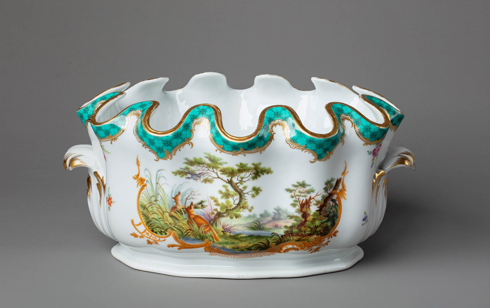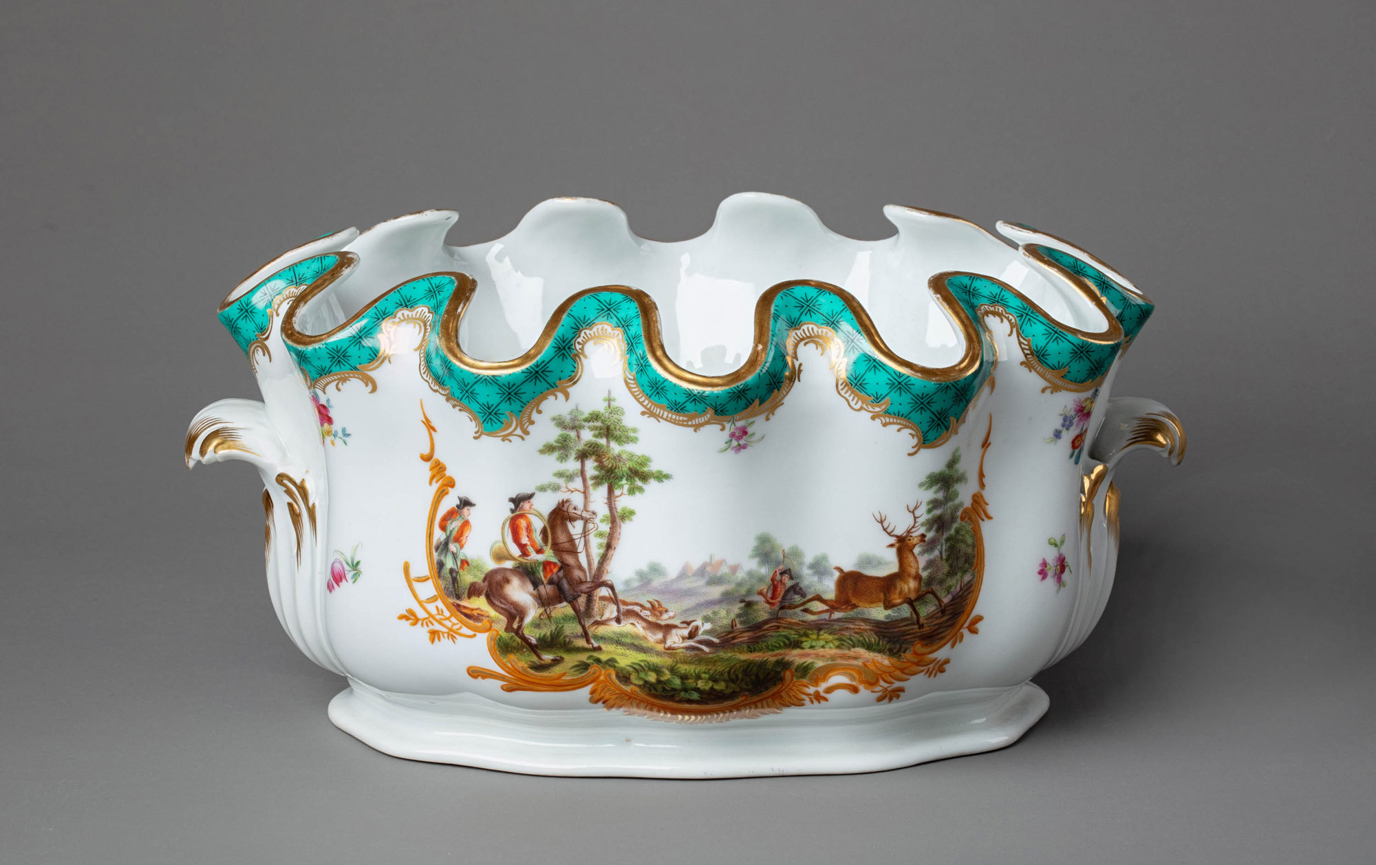 В 1766 году императрица Екатерина II заказала на Мейсенской королевской фарфоровой мануфактуре в Саксонии сервиз для охотничьего домика в Царском Селе. В 1768 году сервиз был готов и привезён в Россию. Было выполнено около тысячи предметов. Создателем сервиза считается Мишель Виктор Асье, назначенный вторым главным скульптором-модельером Мейсена наравне с Кендлером. В росписи изделий были задействованы двадцать девять художников. Охотничьи сценки в большинстве были взяты с гравюр Иоганна Элиаса Ридингера, которые хранились на мануфактуре в Мейсене.