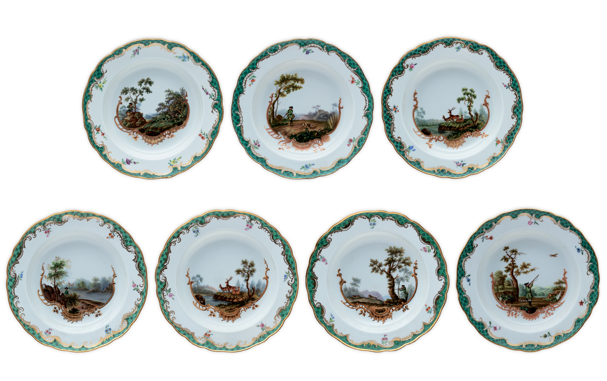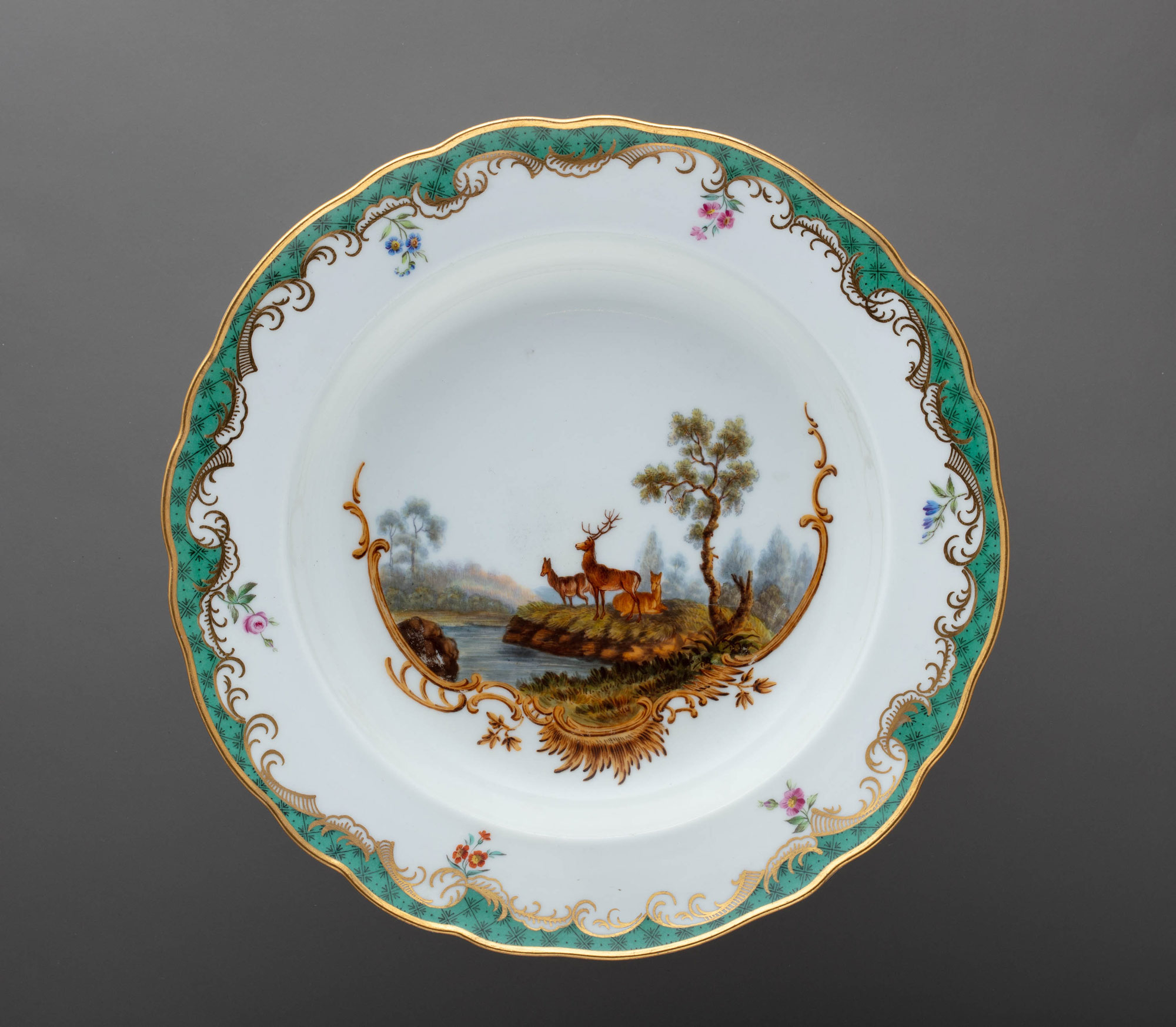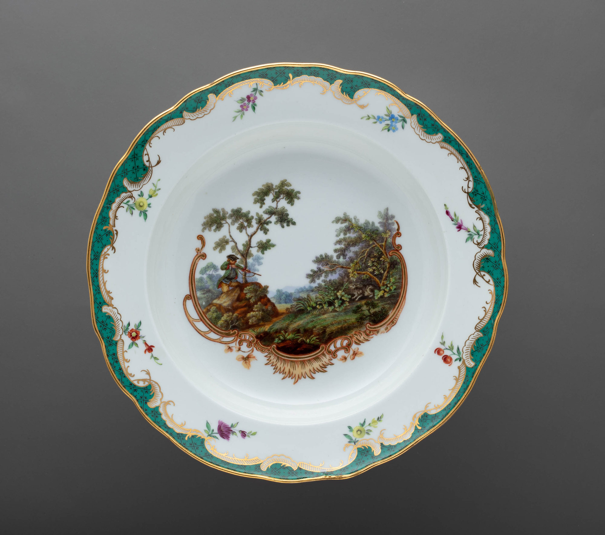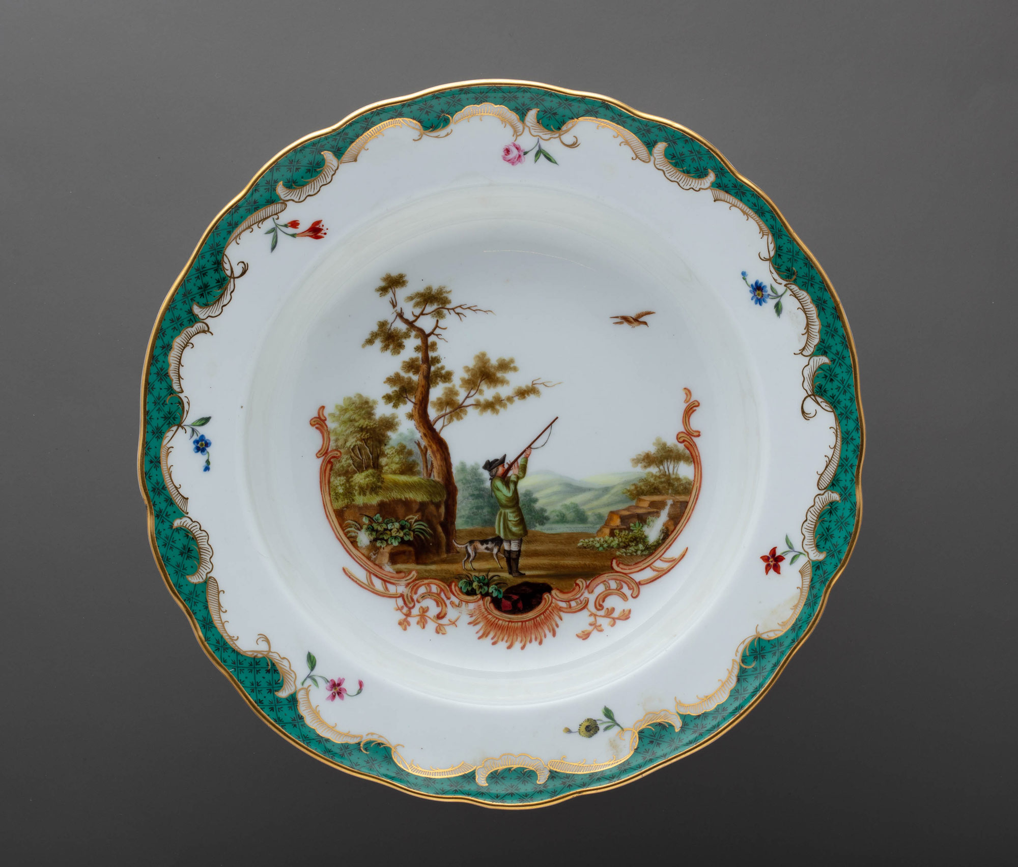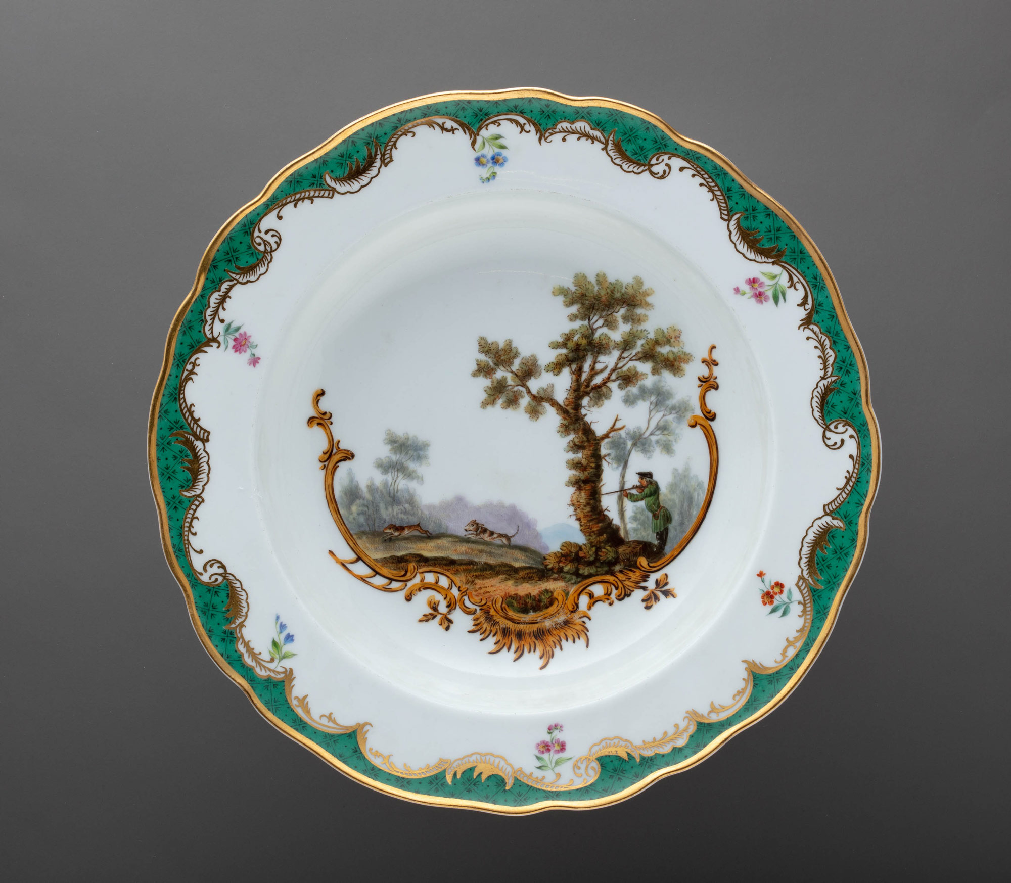 Предметы Охотничьего сервиза, украшенные различными сценами охоты на фоне романтического пейзажа, обрамленного изящными золочёными рокайльными завитками и трельяжной сеткой «травчатого цвета» и «под изумруд», великолепно вписывались в изысканные интерьеры охотничьего замка, построенного также по заказу императрицы для фаворита, и великолепно гармонировали с архитектурным декором, созданным итальянским архитектором Антонио Ринальди.