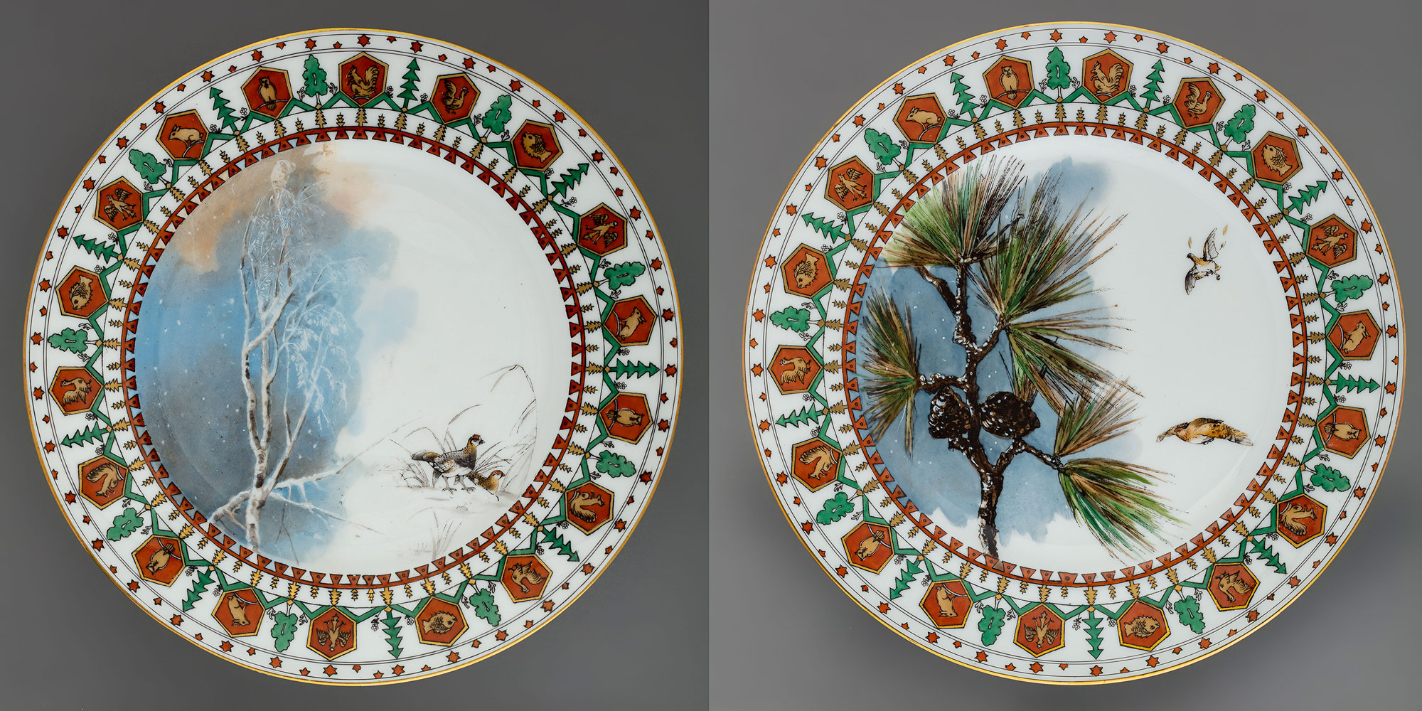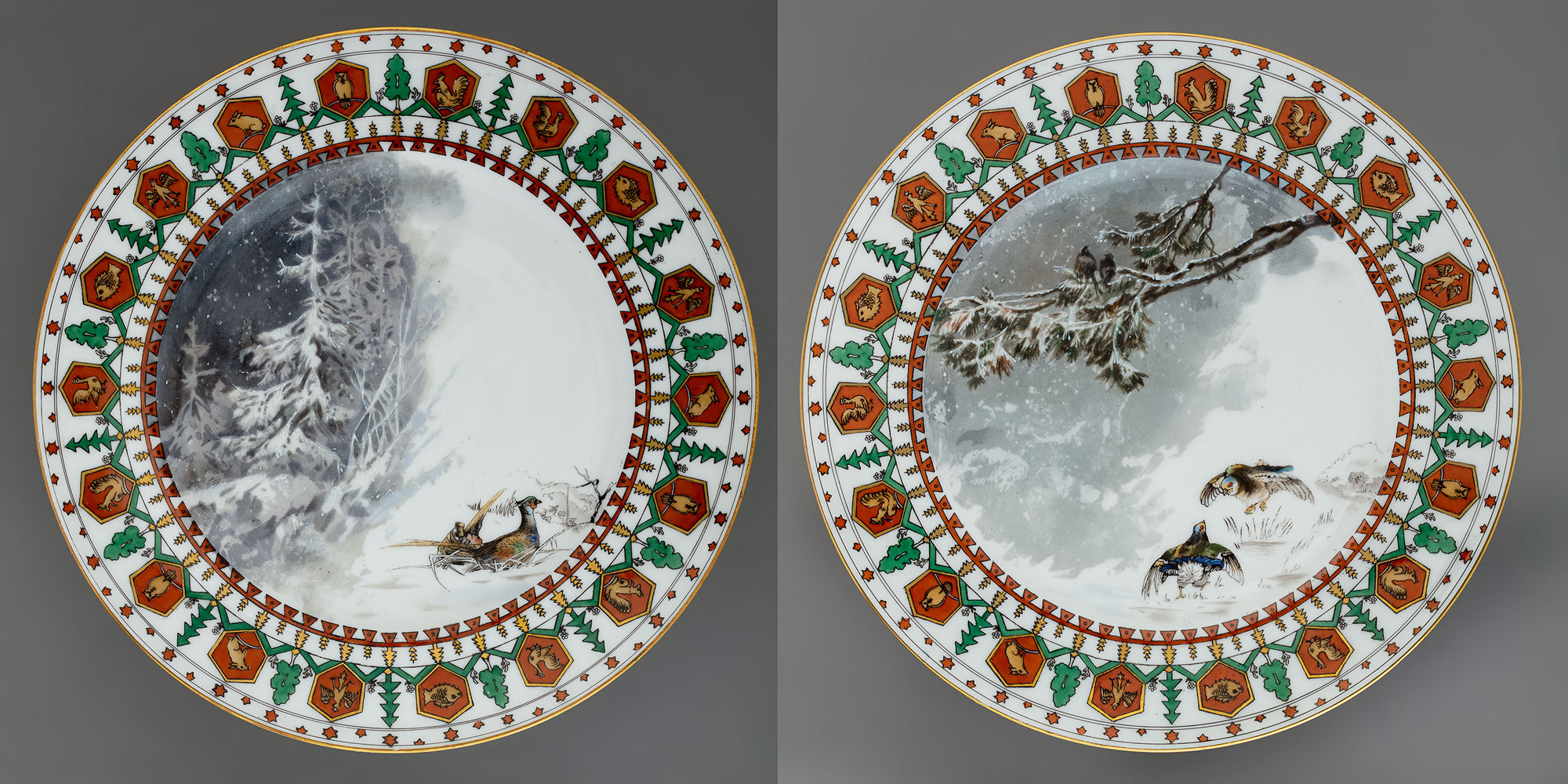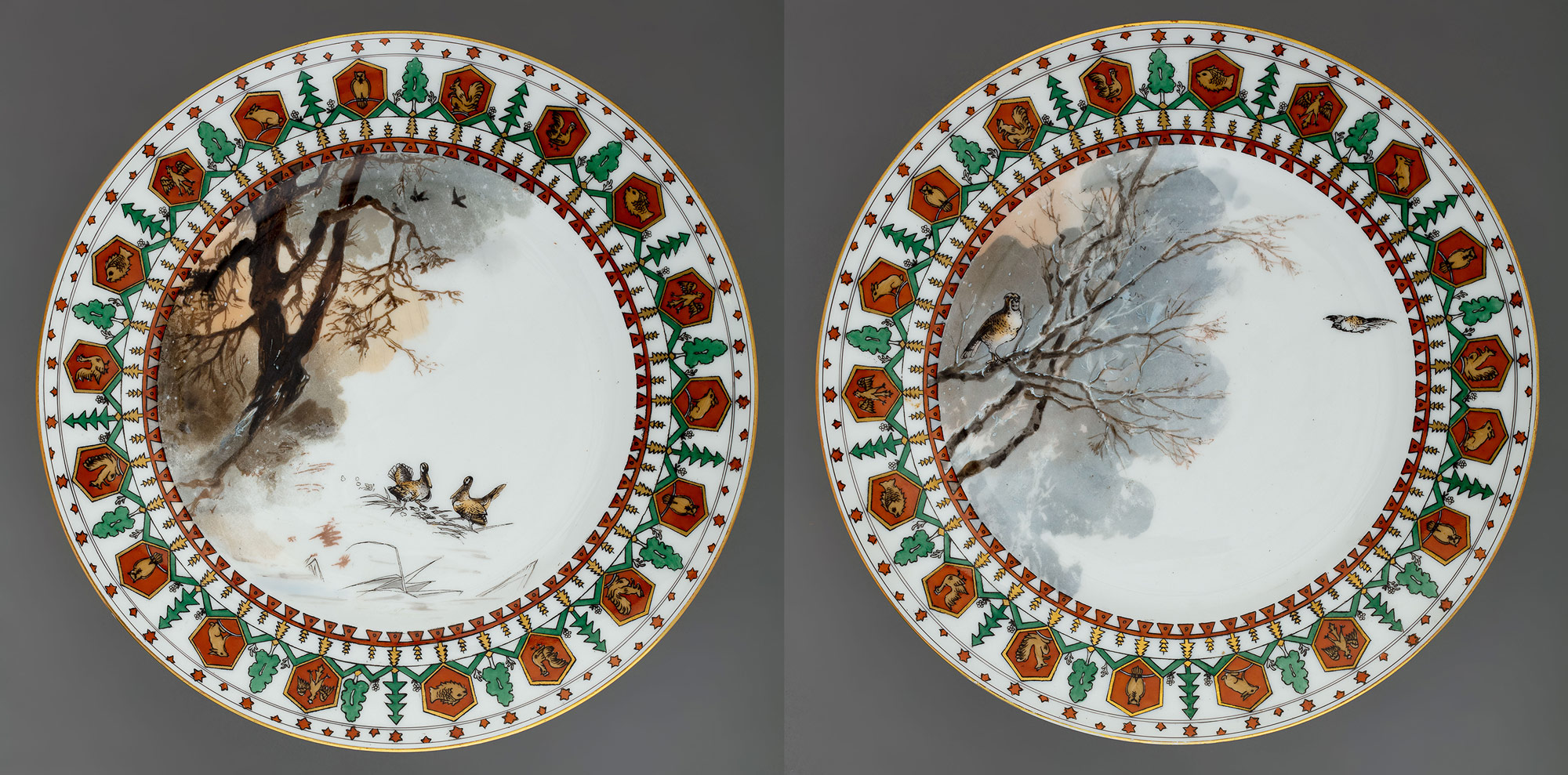 Подпись: надглазурно от руки красным на тарелках — Partridge; Moor cock; на блюде — Eagle Pheasant and fox