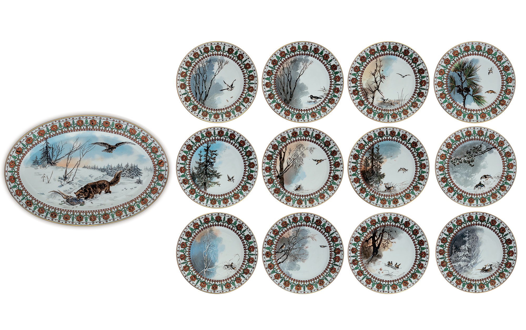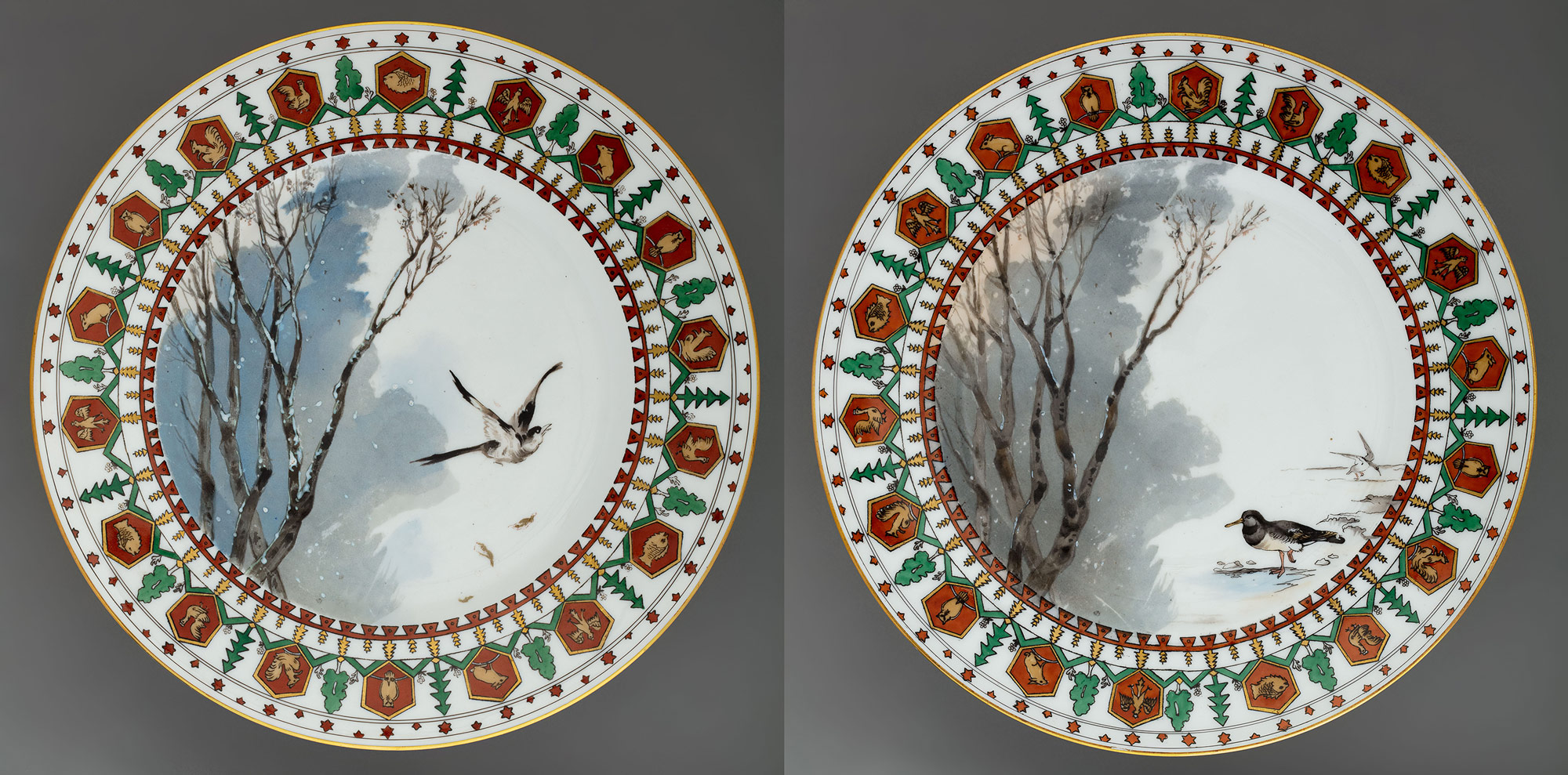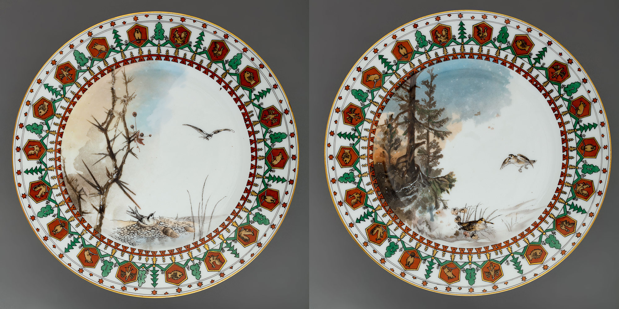 Подпись: надглазурно от руки красным на тарелках — Partridge; Moor cock; на блюде — Eagle Pheasant and fox